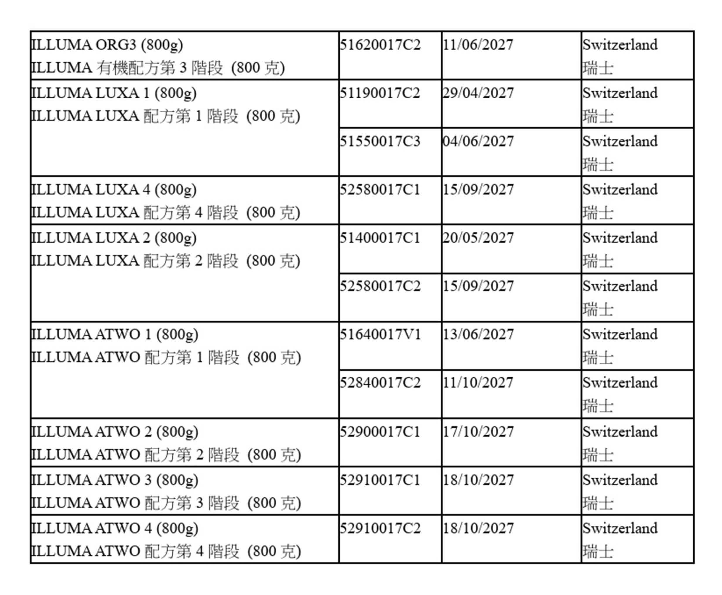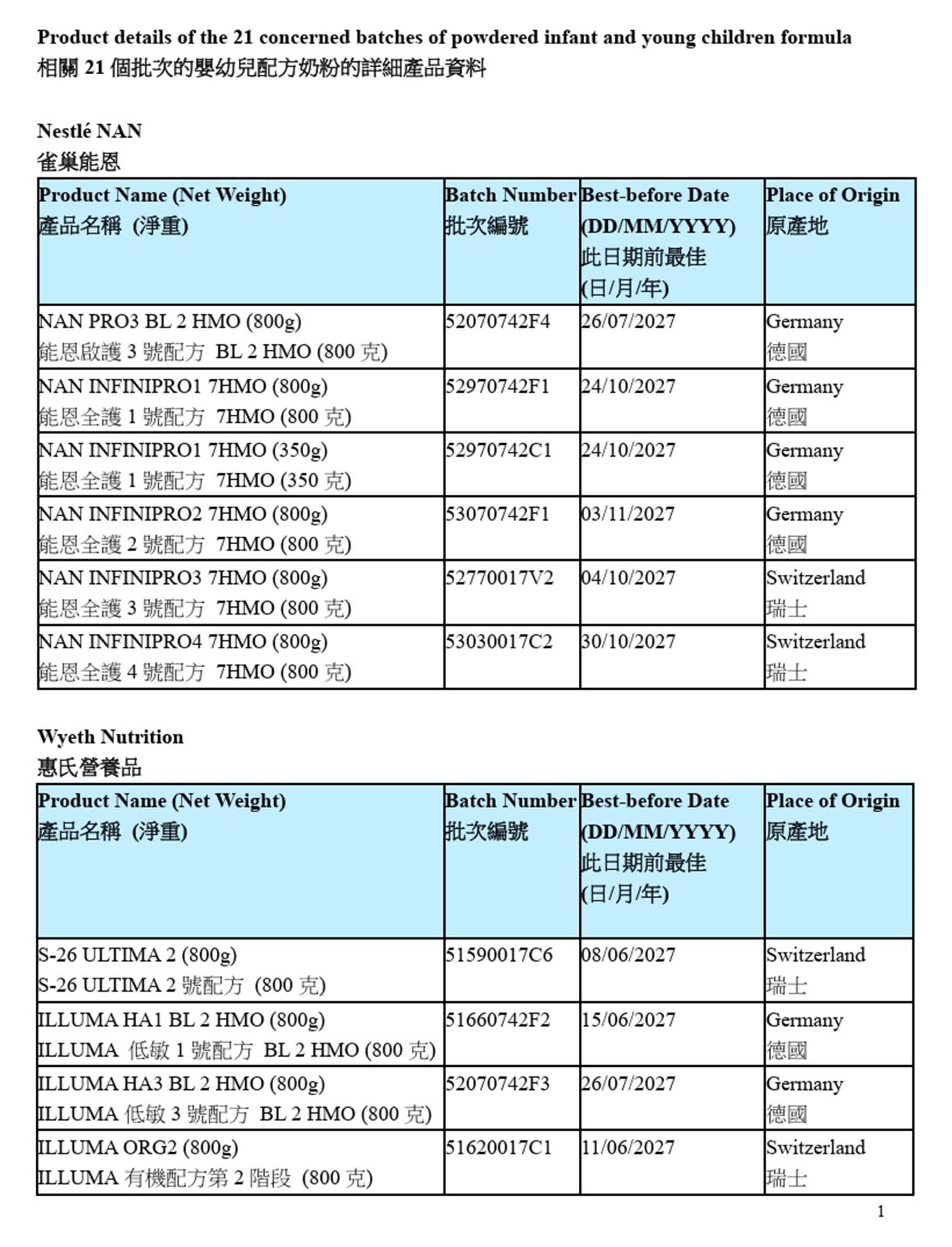 中心發言人表示,雀巢香港現正回收受影響批次產品,市民可於辦公時間致電其熱線2599 8874,查詢有關產品的回收事宜。發言人呼籲市民不要讓嬰幼兒食用受影響批次的產品,如發覺嬰幼兒食用有關產品後不適,應盡快求醫。業界亦應立即停止使用或出售受影響批次產品。相關21個批次的嬰幼兒配方奶粉的詳細產品資料,可參閱附圖。