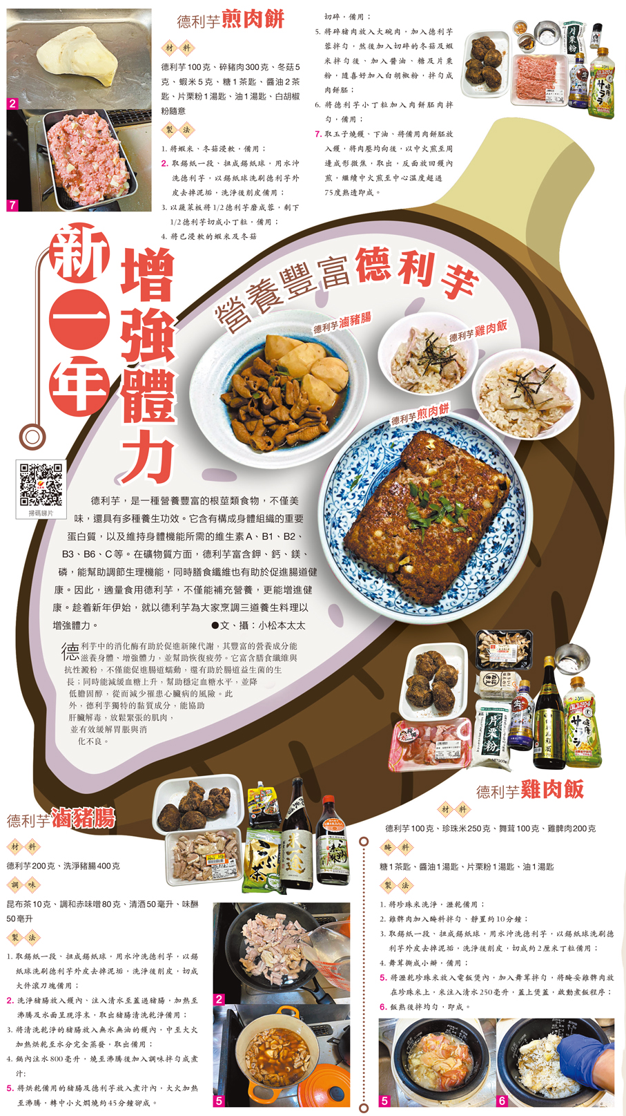 德利芋,是一種營養豐富的根莖類食物,不僅美味,還具有多種養生功效。它含有構成身體組織的重要蛋白質,以及維持身體機能所需的維生素A、B1、B2、B3、B6、C等。在礦物質方面,德利芋富含鉀、鈣、鎂、磷,能幫助調節生理機能,同時膳食纖維也有助於促進腸道健康。因此,適量食用德利芋,不僅能補充營養,更能增進健康。趁着新年伊始,就以德利芋為大家烹調三道養生料理以增強體力。