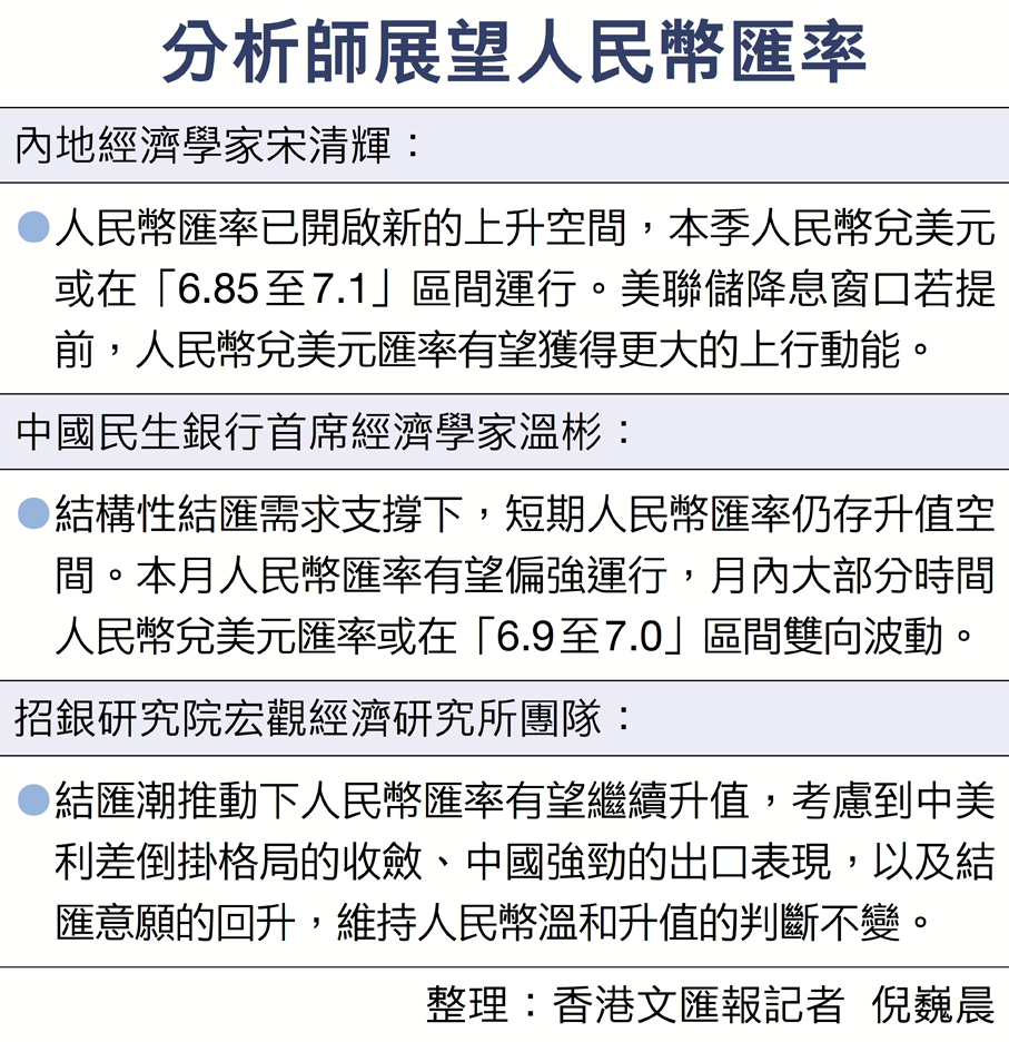 宋清輝相信,人民幣匯率走強有較強基本面支撐,本季匯率料續「穩中有升、雙向波動」格局,鑒於人民幣已開啟新的上升空間,「一季度人民幣兌美元有望在『6.85至7.1』區間運行」。他並提及,春節前市場「結匯潮」仍有釋放空間,疊加中國政策紅利的持續釋放,人民幣有繼續衝高的慣性。此外,本季美國就業和通脹數據的變動若引致美聯儲降息窗口提前,人民幣兌美元匯率將獲得更大的上行動能。