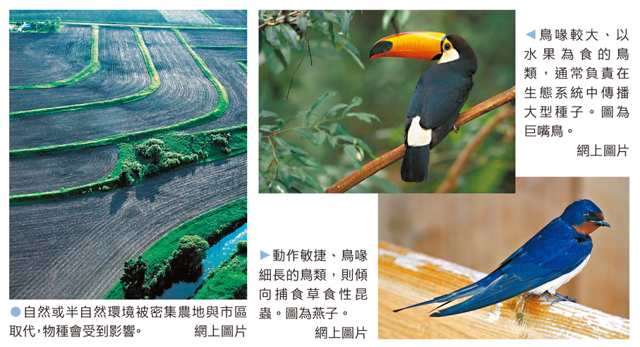 相比之下,當自然或半自然環境被密集農地與市區取代,物種會受到影響,特別是種子傳播與昆蟲控制等功能,會變得依賴少數物種,導致生態系統運作變得脆弱。