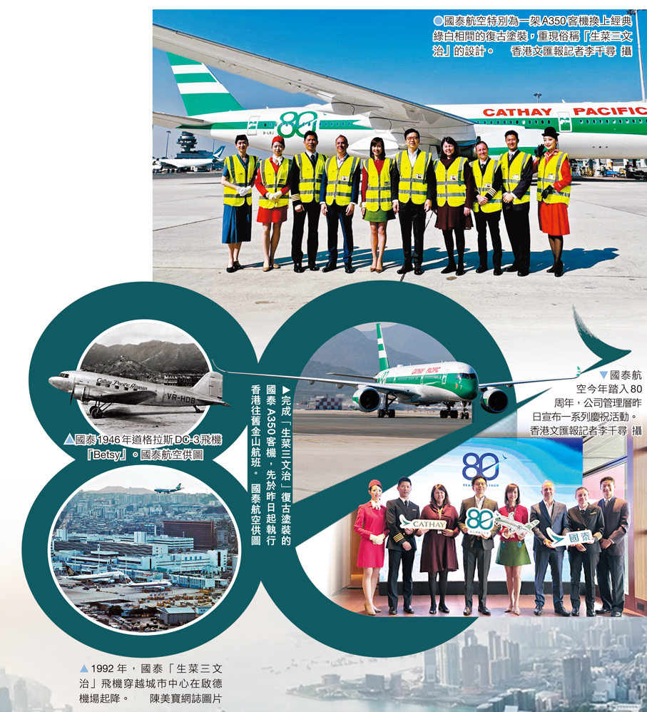 林紹波亦笑言,「生菜三文治」塗裝能喚起不少市民對啟德機場年代的回憶。而為慶祝成立80周年,國泰將一架空中巴士A350客機及一架波音747貨機重新塗裝為這款經典設計,並於本月起投入全球航班服務,讓香港及世界各地旅客有機會一睹其復古風采。