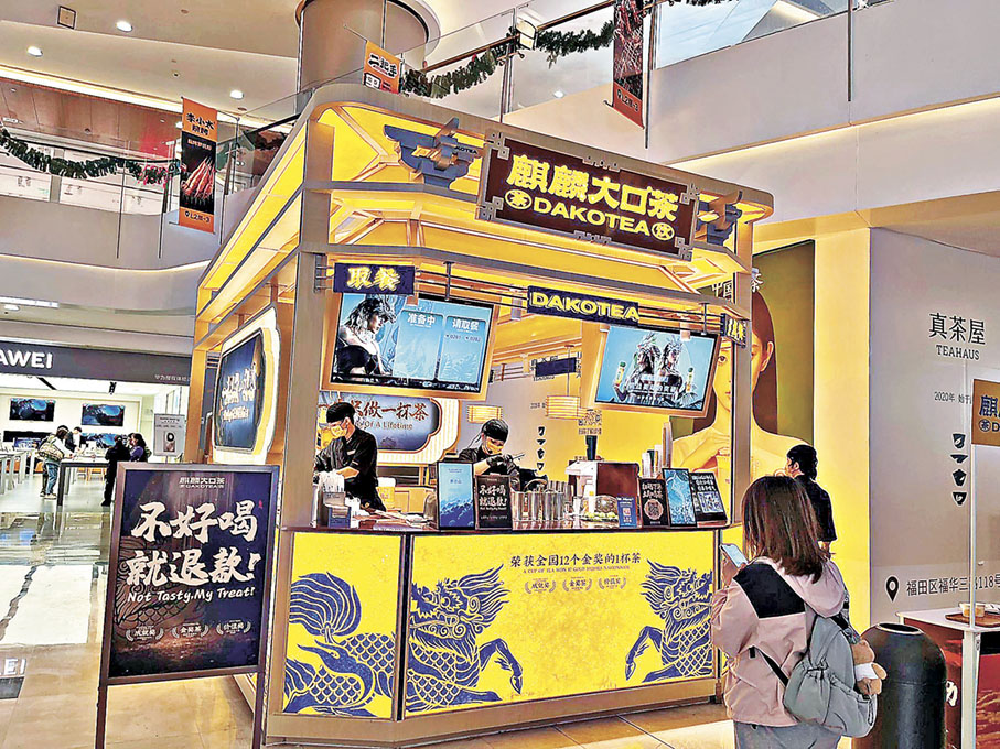 來自雲南保山、2017年創立的特色檸檬茶品牌「麒麟大口茶」去年尾空降福田皇庭廣場B1層。品牌宣傳口號是「榮獲12個金獎的一杯茶」,現時在深圳有8間店,店家不做其他飲品,只賣麒麟大口茶,分正常糖、少糖及微糖三款,確保品質穩定、口味獨特,旋即風靡不少港客,即使閒日店外也經常大排長龍。品牌特別以「一生只做一杯茶」作賣點,主打使用雲南高山糯米香茶底與獨特香水檸檬,結合手工冰糖漿,口感清新,與大家平日飲的港式檸檬茶及鴨屎香檸檬茶有別,並強調天然無添加,追求「大口喝、大口笑」的爽口體驗,一杯檸檬茶¥17的價位亦可接受。