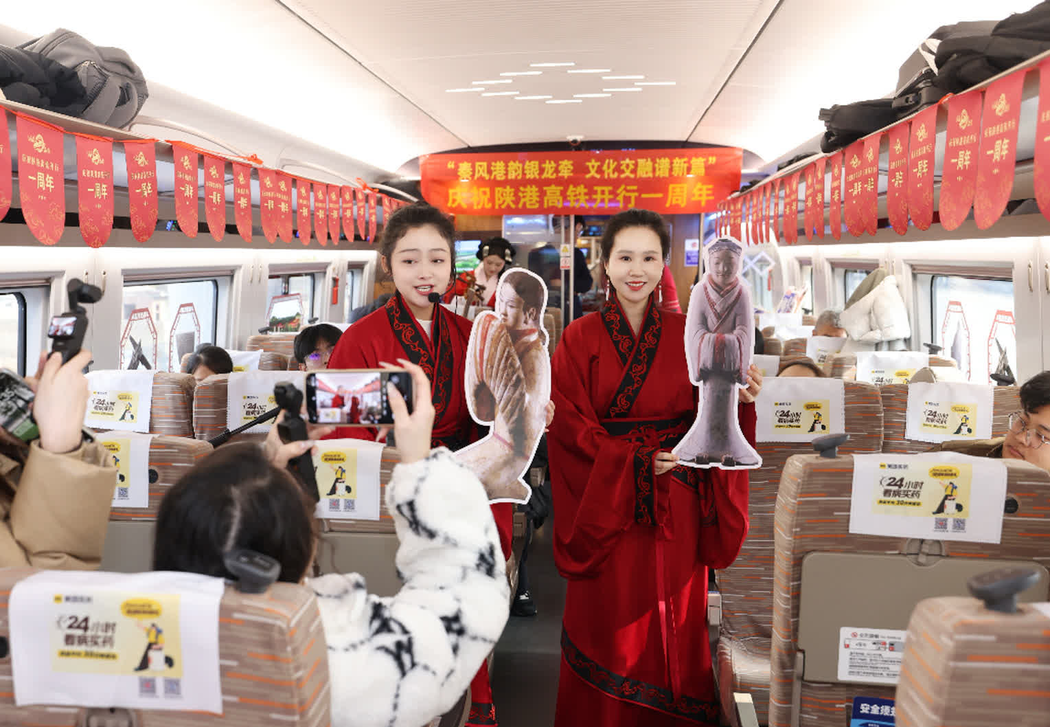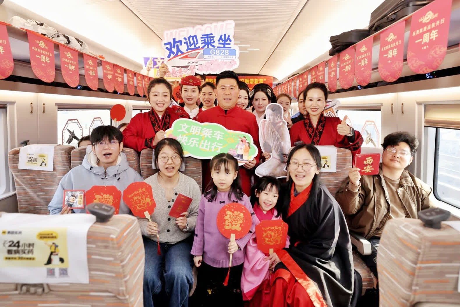 (香港文匯網記者 李陽波)身着漢服的禮儀人員以標準漢禮相迎,車廂內的文化雅集豐富多彩,漢陽陵博物院「鎮館之寶」彩繪女傭文物複製品栩栩如生……2026年1月5日,為慶祝陝西至香港高鐵開行一周年,中國鐵路西安局集團有限公司聯合漢景帝陽陵博物院,在西安北至香港西九龍的G828次列車上舉辦了「高鐵流動博物館」主題活動,吸引了眾多旅客參與。據悉,一年來陝西至香港高鐵累計開行730列,發送旅客201.78萬人次。