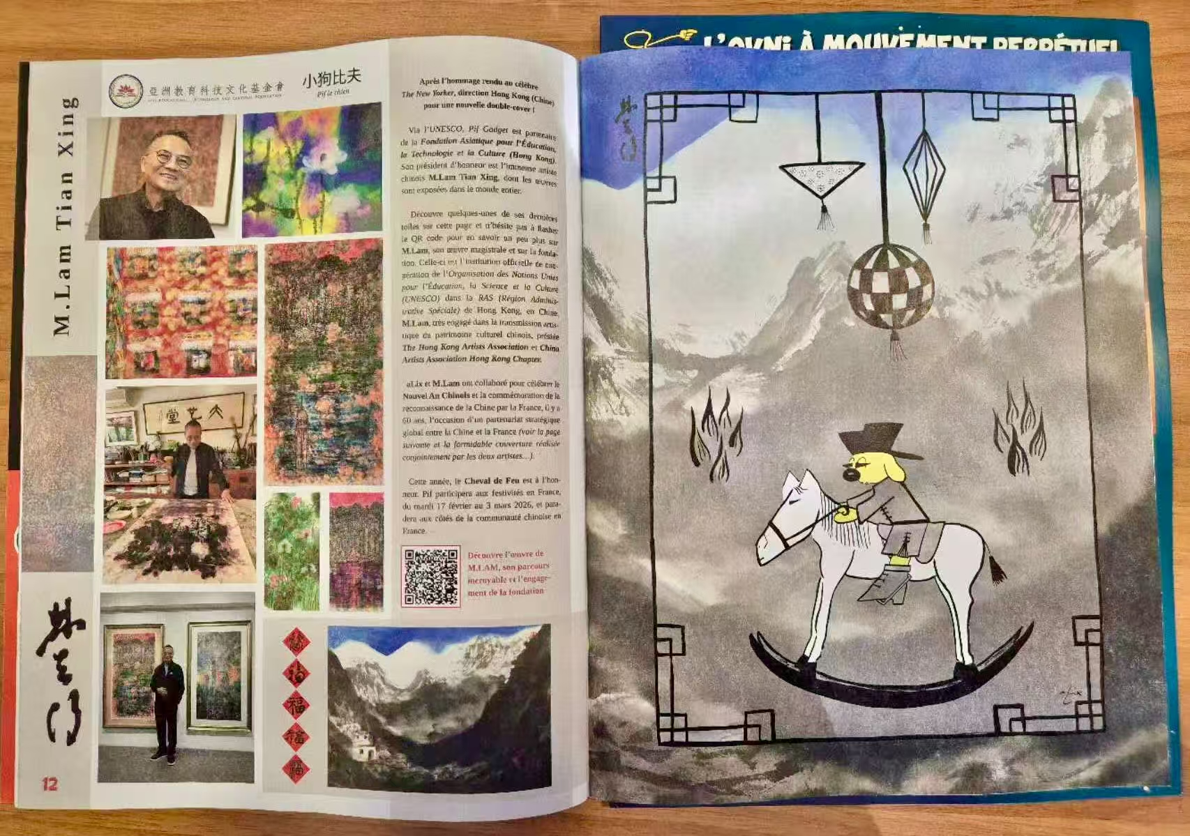 林天行表示,本次合作歷時數月,「我們與《PIF Gadget》團隊反覆溝通、精益求精,最終封面選用了畫作《香江煥彩》,融合我的五款『福』字書法,寓意五福臨門,並與雜誌經典角色『小狗比夫』幽默造型巧妙結合,創造出一場東西方美學的精彩對話。」