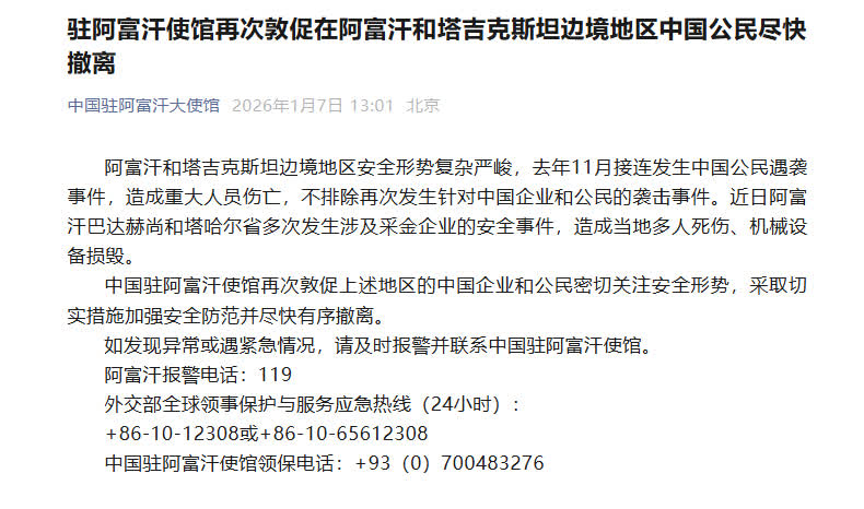 中國駐阿富汗使館再次敦促上述地區的中國企業和公民密切關注安全形勢,採取切實措施加強安全防範並盡快有序撤離。