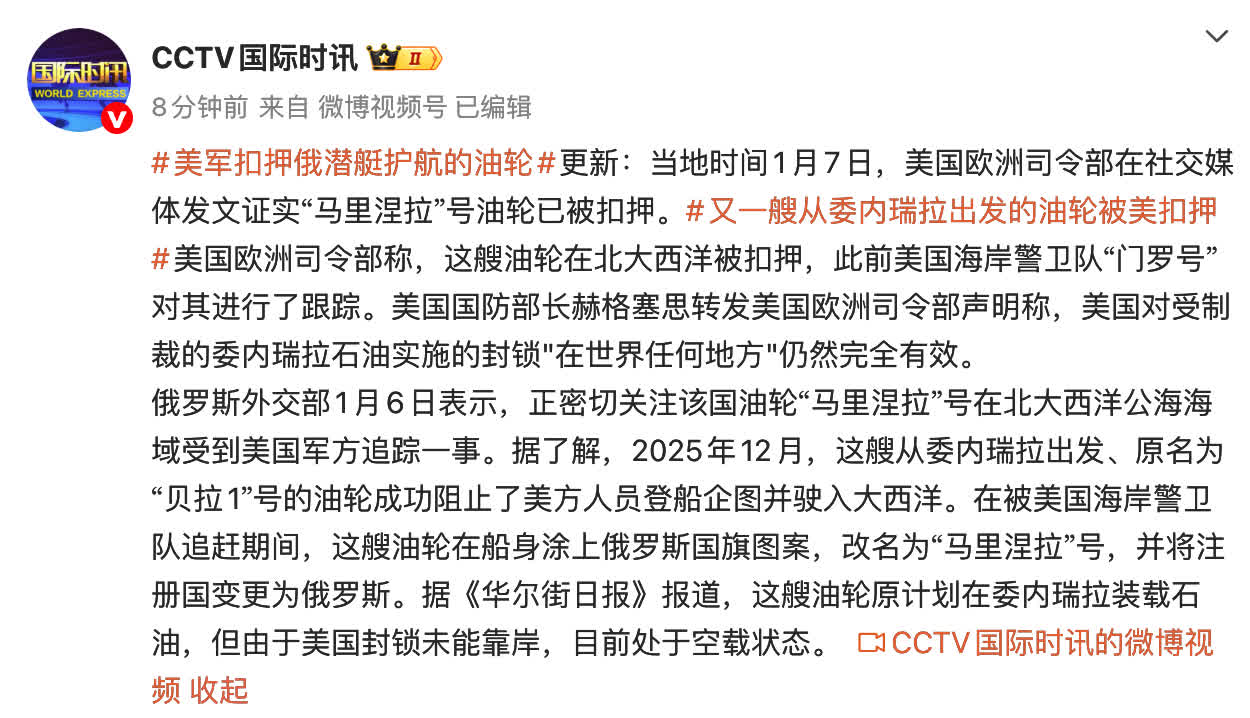 據CCTV國際時訊消息,當地時間1月7日,美國歐洲司令部在社交媒體發文證實「馬里涅拉」號油輪已被扣押。美國歐洲司令部稱,這艘油輪在北大西洋被扣押,此前美國海岸警衛隊「門羅號」對其進行了跟蹤。美國國防部長赫格塞思轉發美國歐洲司令部聲明稱,美國對受制裁的委內瑞拉石油實施的封鎖「在世界任何地方」仍然完全有效。