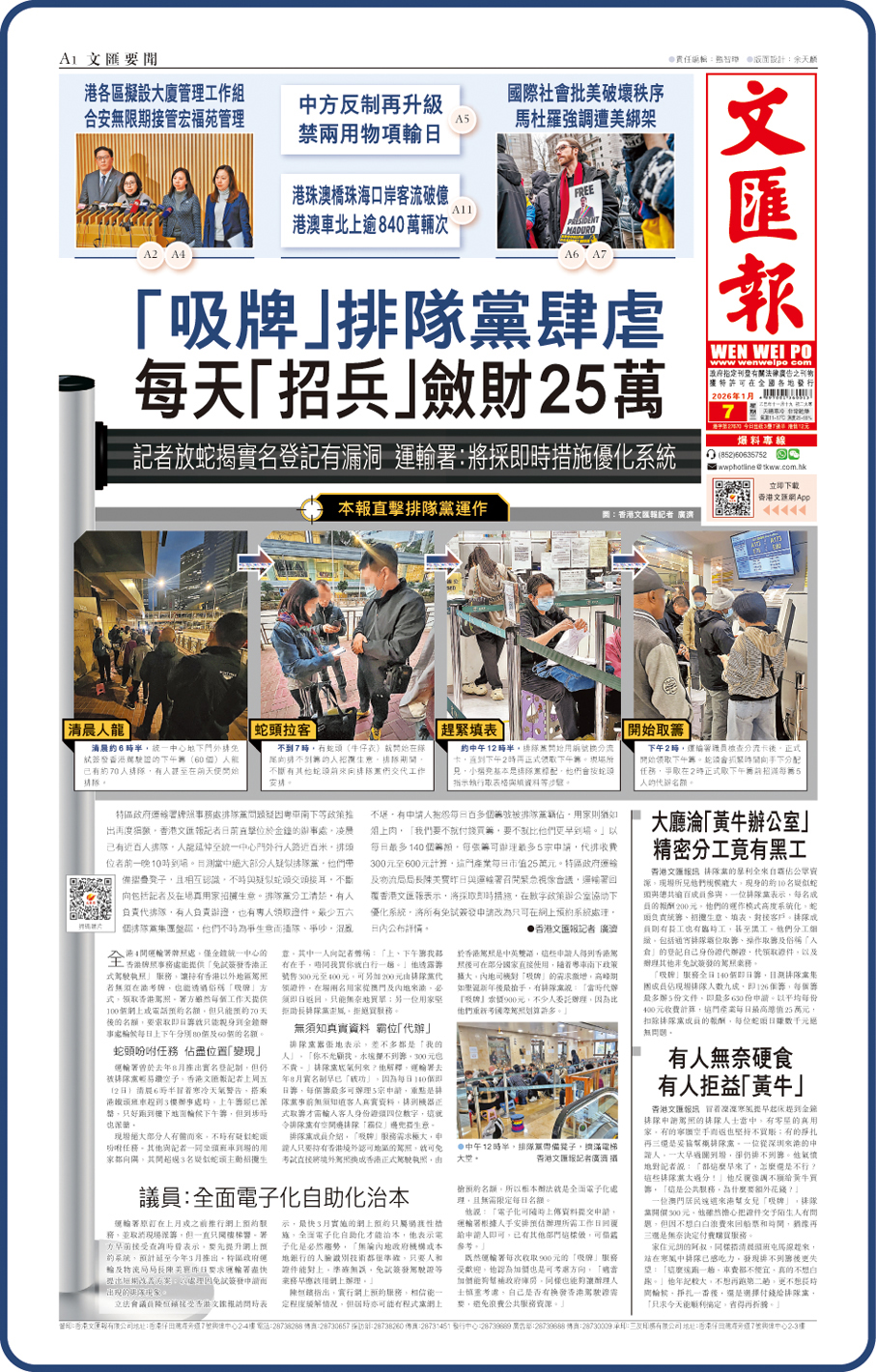 金鐘運輸署牌照事務處排隊黨亂象愈演愈烈,香港文匯報昨日(1月7日)頭版獨家調查報道《「吸牌」排隊黨肆虐 每天「招兵」斂財25萬》見報後,特區政府運輸署昨日下午迅速宣布,由下周一(12日)起,金鐘統一中心的香港牌照事務處將對申請免試簽發香港正式駕駛執照(俗稱「吸牌」)實施「電子即日籌」安排,全面取代現場派籌,以應付與日俱增的需求,並確保真正有需要的市民能公平有序地使用服務。同時,運輸署正與數字政策辦公室合作,優化現有網上預約系統,長遠而言會積極研究引入人工智能(AI)技術處理申請程序,讓服務更便捷高效。
