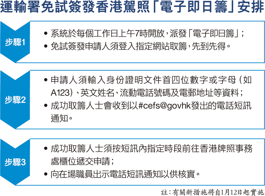 昨日下午,運輸署公布有關新措施,由下周一開始實施「電子即日籌」安排,以優化申請程序。