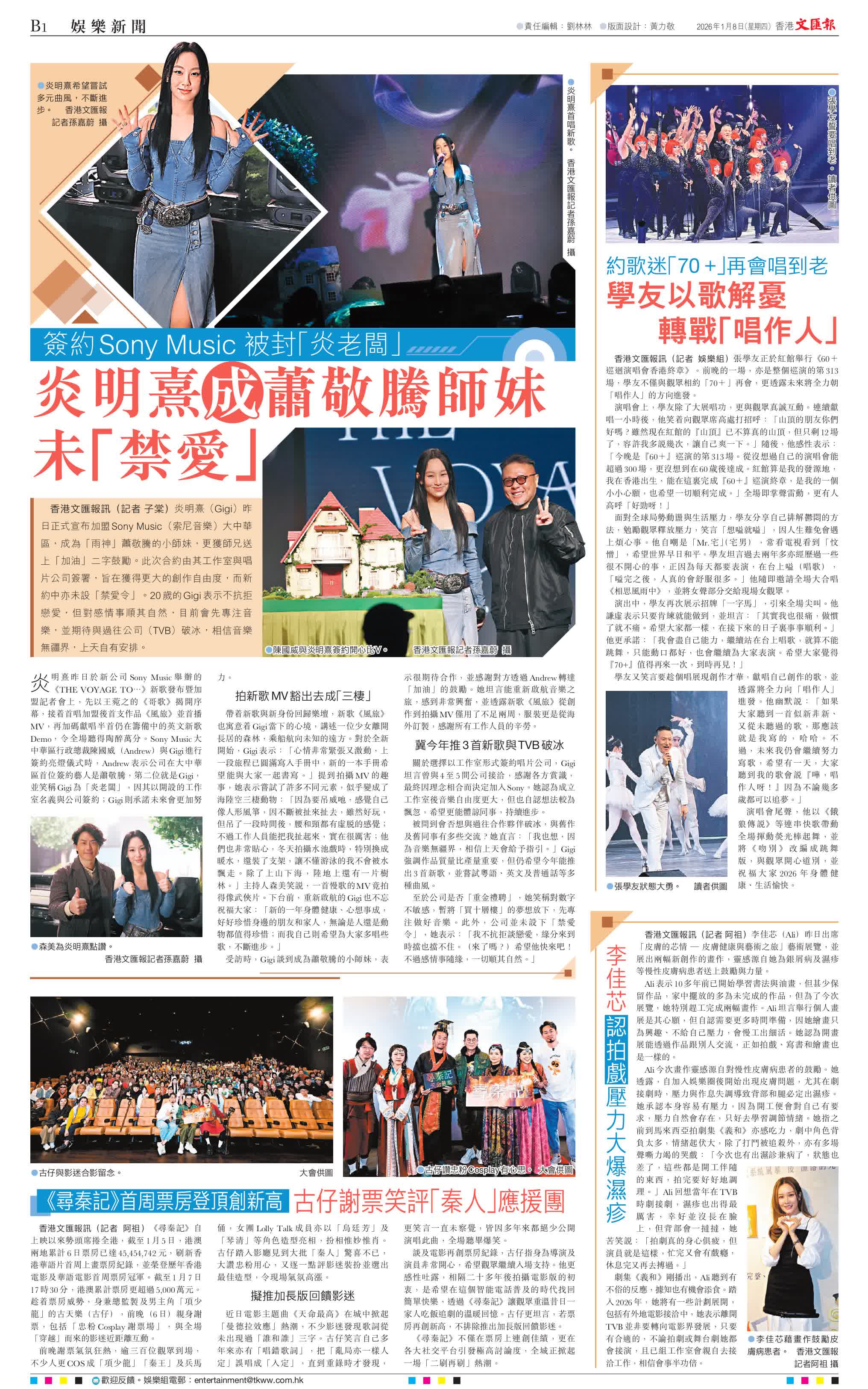 香港文匯報訊(記者 子棠)炎明熹(Gigi)昨日正式宣布加盟Sony Music(索尼音樂)大中華區,成為「雨神」蕭敬騰的小師妹,更獲師兄送上「加油」二字鼓勵。此次合約由其工作室與唱片公司簽署,旨在獲得更大的創作自由度,而新約中亦未設「禁愛令」。20歲的Gigi表示不抗拒戀愛,但對感情事順其自然,目前會先專注音樂,並期待與過往公司(TVB)破冰,相信音樂無疆界,上天自有安排。