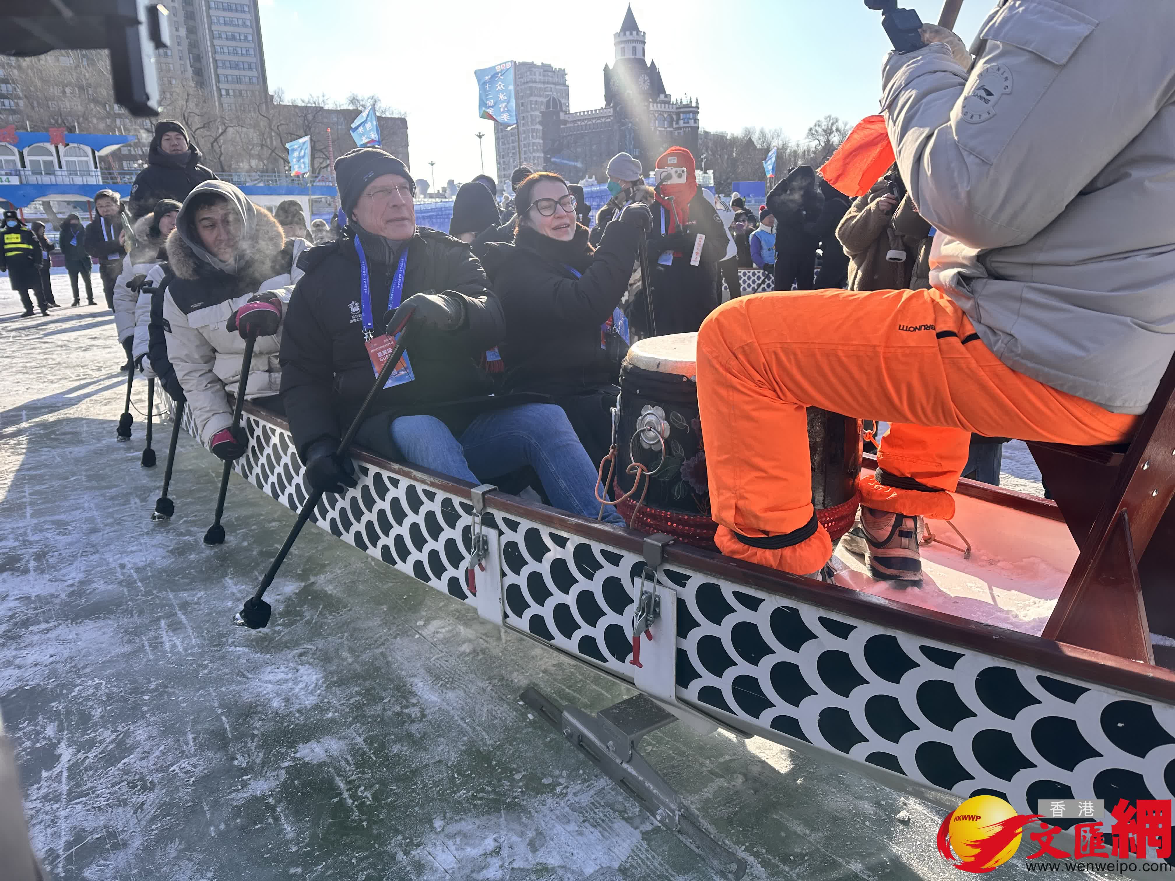 尤其是看到冰龍舟的熱血訓練,外國市長嘉賓蠢蠢欲動,登上龍舟,手握冰鎬,從不會發力,到找到節奏加速前行,熱火朝天的訓練場景,瞬間點燃了現場氛圍。冰上龍舟從傳統的水上龍舟演變而來,是為了豐富冬季戶外運動和冰雪旅遊而形成的新形態。2006年,來自哈爾濱的運動愛好者在傳統水上龍舟的基礎上,經過運動力學改造和冰雪文化賦能,在全國首創了冰上龍舟這一項目,將盛行於中國南方的龍舟文化與北國的寒地環境進行創造性結合,體現了「南俗北展」的文化融合智慧。「用鼓聲做號令,我很佩服中國古代人民的智慧。」德國馬格德堡市副市長索斯藤·克羅爾說。
