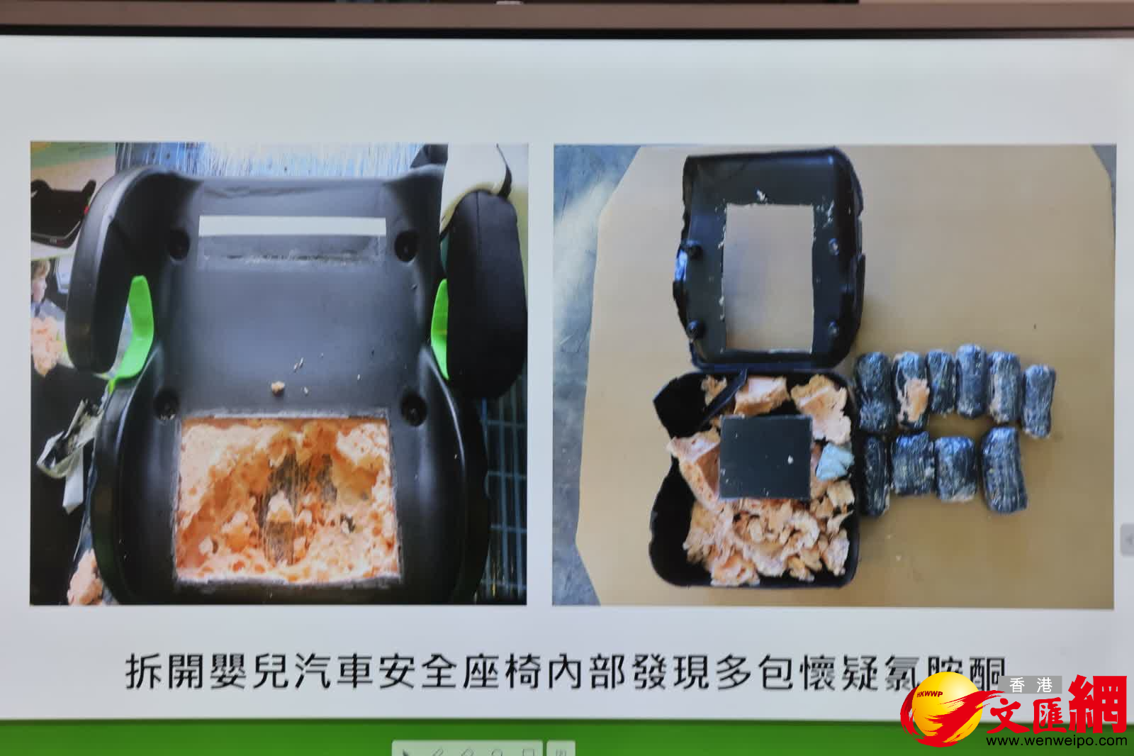 當關員打開紙箱後,發現每箱分別有一張嬰兒汽車座椅,而且有真空膠膜包裝,包裝精美,在拆開包裝後,人員發現嬰兒汽車座椅底部,有被重新黏貼痕跡及有黑色膠紙包裝,關員隨即使用不同工具輔助,鎅開嬰兒汽車座椅底部進行檢查,結果發現內部注滿了膨脹膠,在鎅開膨脹膠後,發現內裡有多包用黑色膠紙封好的氯胺酮。經關員專業的技巧及細緻的嘗試,成功在5張嬰兒汽車座椅內,檢獲55包懷疑氯胺酮,共重約15.6公斤,市值約770萬元。