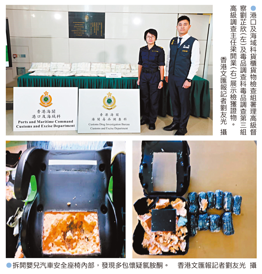 香港文匯報訊(記者 蕭景源)香港海關透過風險評估及情報分析,上月中分別由荷蘭及西班牙經海運入口報稱載有汽車頭枕及嬰兒汽車安全座椅的貨物內,共檢獲36.2公斤俗稱K仔的毒品氯胺酮,市值約1,800萬元,行動中共拘捕3人。