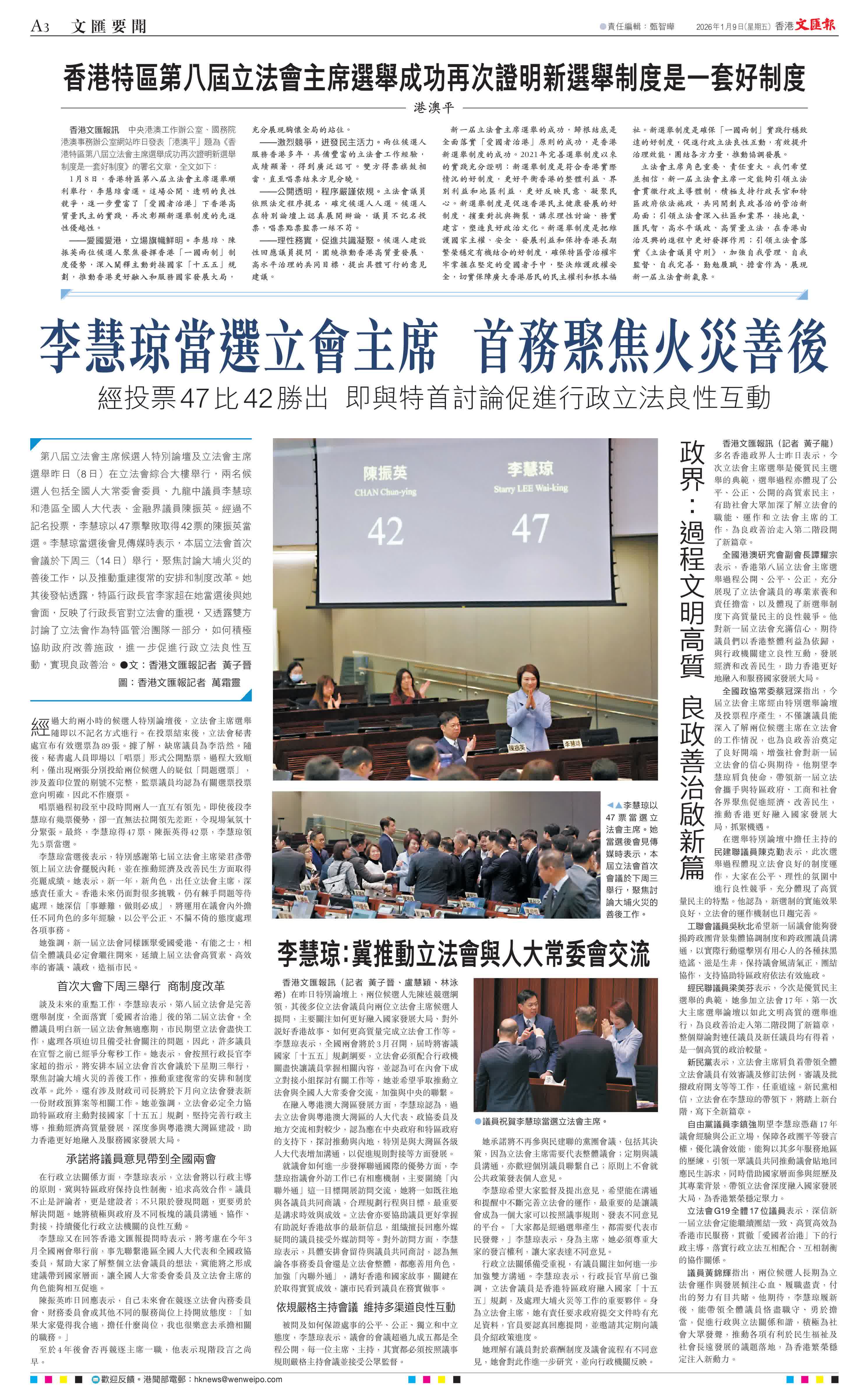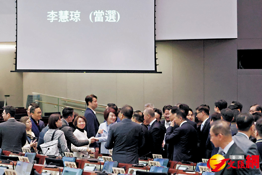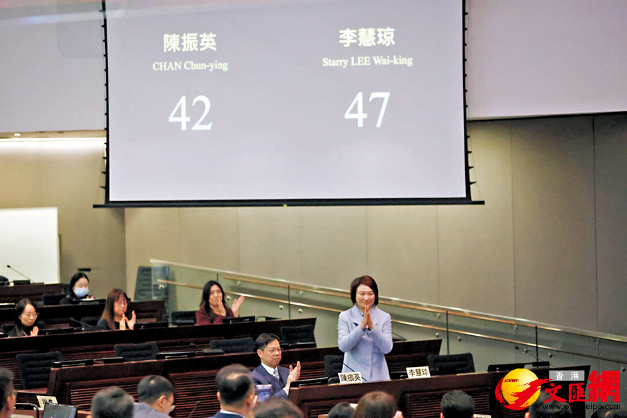 (香港文匯報記者 黃子晉)第八屆立法會主席候選人特別論壇及立法會主席選舉昨日(8日)在立法會綜合大樓舉行,兩名候選人包括全國人大常委會委員、九龍中議員李慧琼和港區全國人大代表、金融界議員陳振英。經過不記名投票,李慧琼以47票擊敗取得42票的陳振英當選。李慧琼當選後會見傳媒時表示,本屆立法會首次會議於下周三(14日)舉行,聚焦討論大埔火災的善後工作,以及推動重建復常的安排和制度改革。她其後發帖透露,特區行政長官李家超在她當選後與她會面,反映了行政長官對立法會的重視,又透露雙方討論了立法會作為特區管治團隊一部分,如何積極協助政府改善施政,進一步促進行政立法良性互動,實現良政善治。