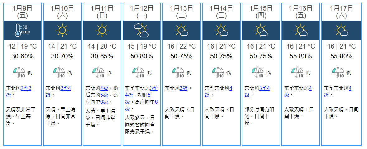 天文台料,今日天晴及非常乾燥。早上寒冷,新界部分地區嚴寒。日間最高氣溫約19度。吹輕微至和緩東北風。未來一兩日氣溫稍為回升,天氣非常乾燥,但早上清涼。星期一風勢頗大,短暫時間有陽光。下周中期日間和暖。