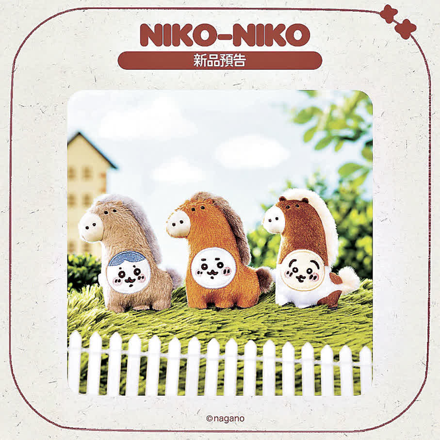 為迎接2026丙午馬年,Chiikawa推出一系列以「午年(馬年)」為主題的全新精品。今次品牌一改可愛風格,讓兔兔變身成為搞怪馬頭造型,成為新年必收的「神級」精品。另一款「UMA TO NARU」毛絨襟章套裝。Chiikawa三小隻吉伊卡哇、小八貓及兔兔,全部變身可愛「小馬」,穿上不同顏色的馬匹裝束。這款襟章可以別在衣物或帆布袋上,粉絲們可以入手成為馬年幸運符,伴你幸運出行。兩款馬年精品會在本港NIKO-NIKO門市全線同步上架,粉絲們不要錯過啦!