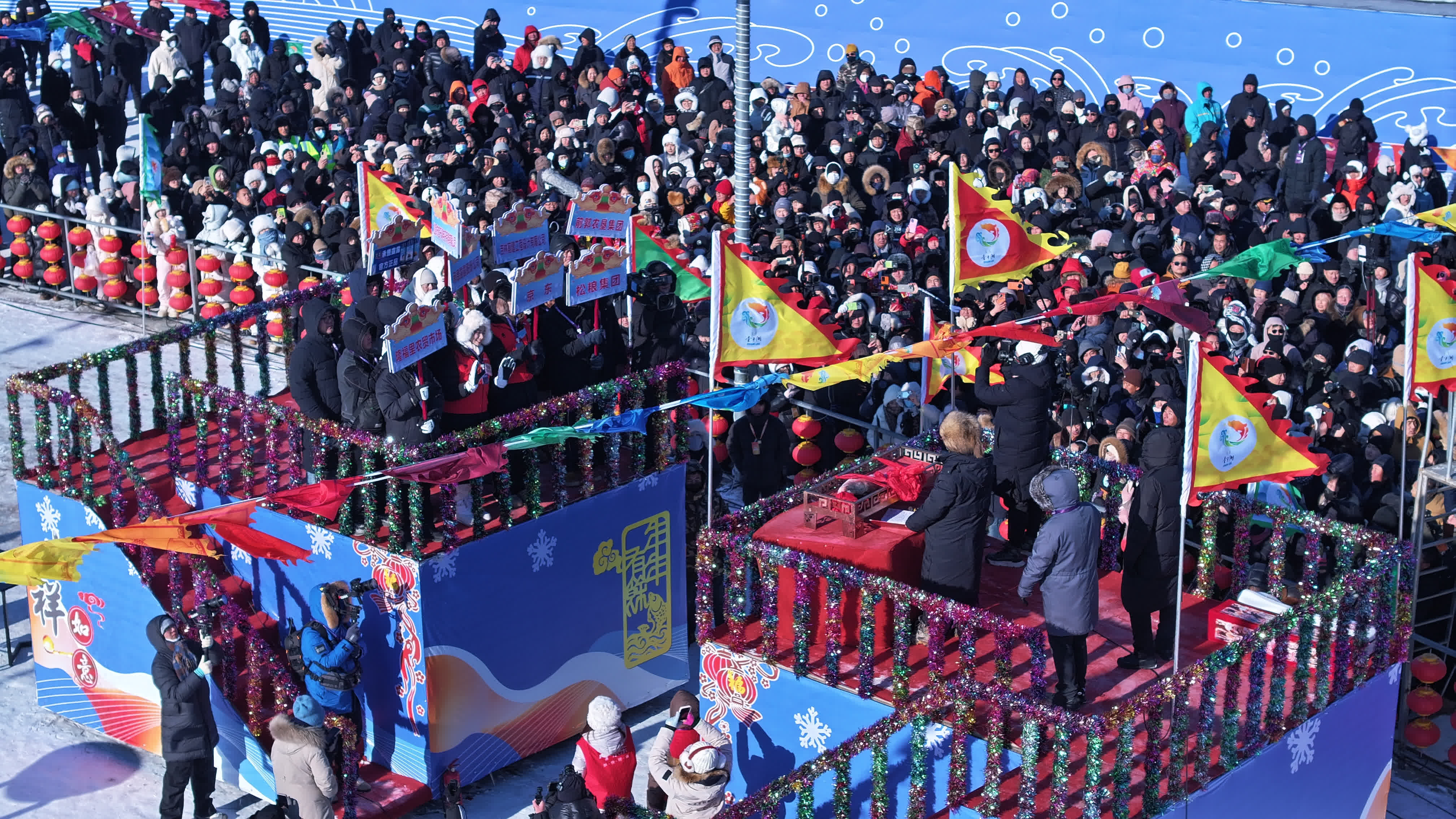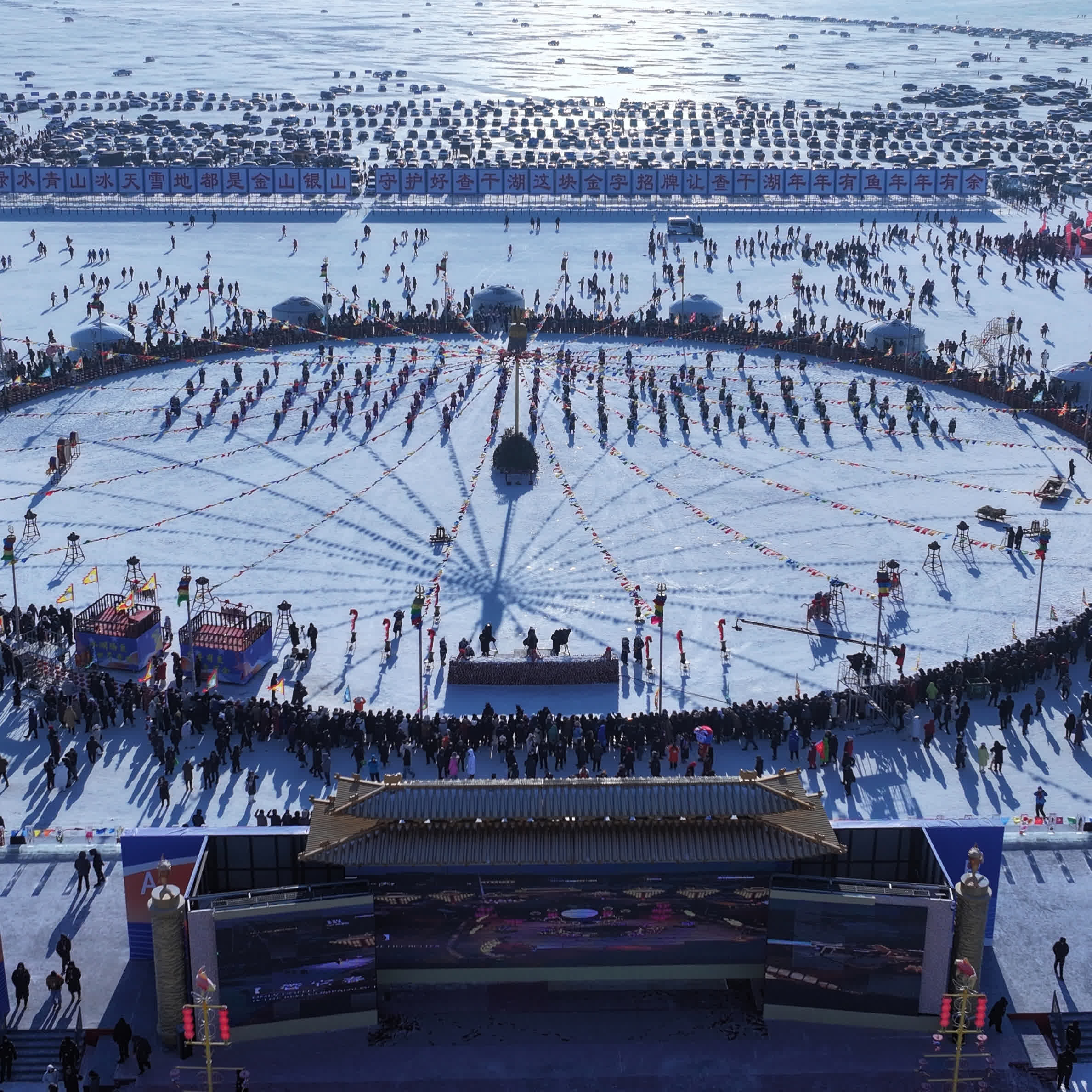開幕式當日,查干湖捺缽廣場上鼓聲激越、琴韻悠揚。熱烈歡快的《冰湖琴舞》拉開演出序幕,原創歌曲《向北行》將開幕式推向高潮。隨後,傳統祭湖醒網儀式莊重上演,灑祭、博舞、誦詞、喝壯行酒……古老儀式歷久彌新,傳遞着對自然的敬畏與對豐收的祈願。與往年不同,今年的查干湖不只是一處觀禮之地,而是一本可以親手翻閱、身臨其章的「立體話本」,處處藏有驚喜。