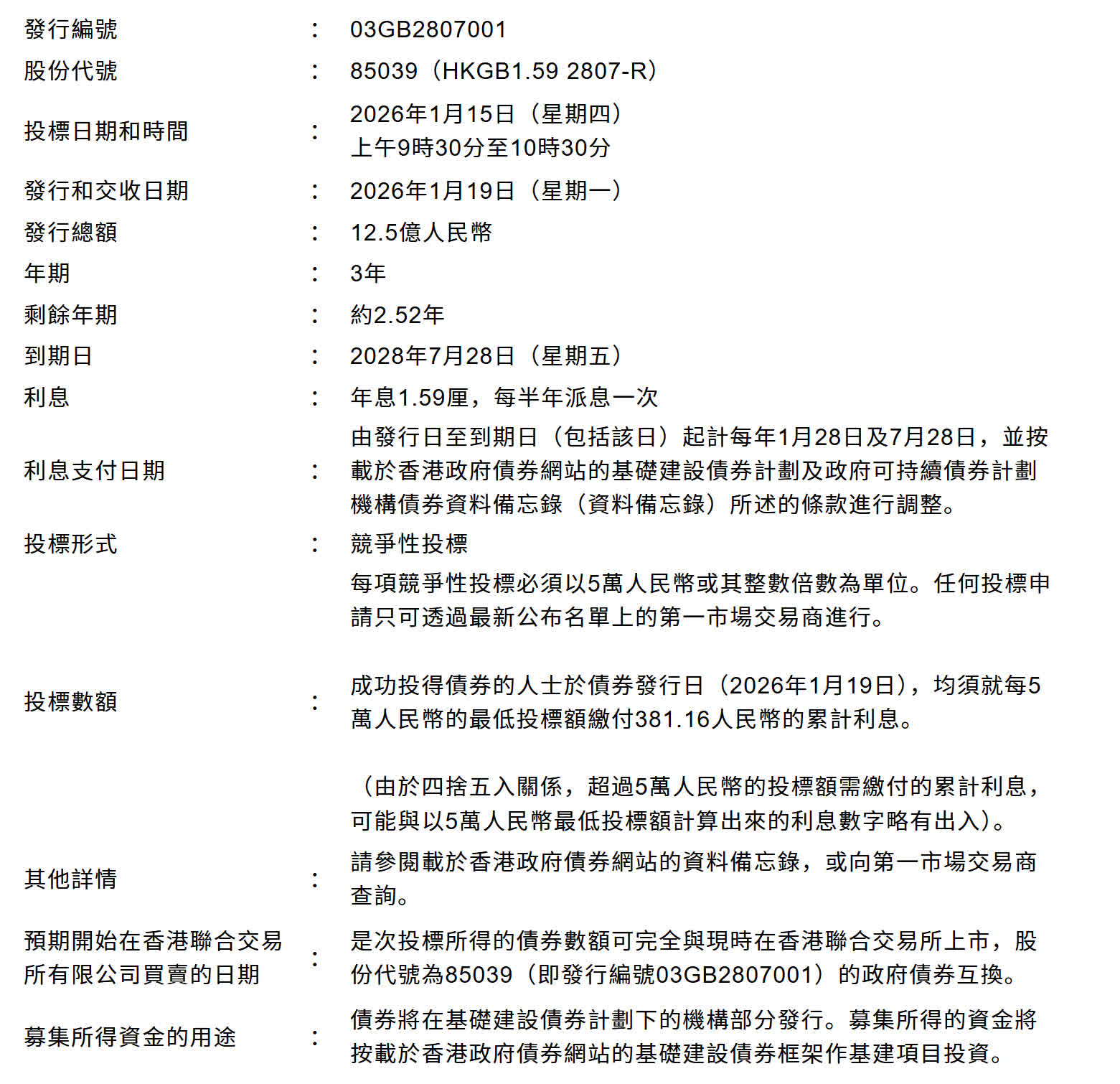 透過是次重開債券,將有額外12.5億人民幣的未到期3年期債券(發行編號03GB2807001)供投標。該批債券將於2028年7月28日期滿,利率為年息1.59厘,每半年派息一次。該批債券於2026年一月九日的指示價格為99.47,半年化收益率則為1.805%。