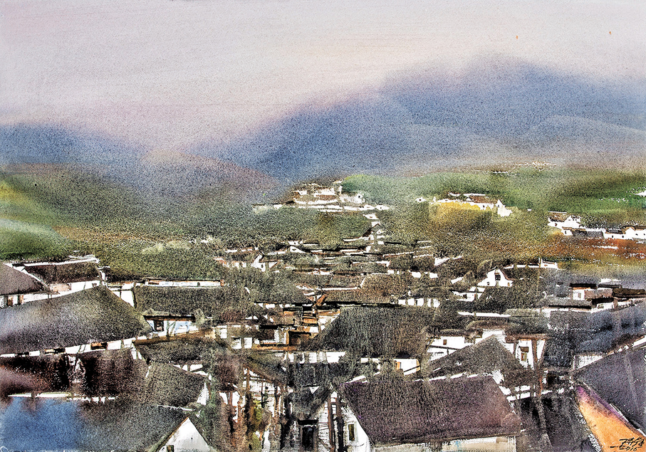 水彩是歐洲的傳統繪畫語言,但從百多年前傳入中國的那一天起,中國人就以獨特的審美意趣對其吸收、改造、豐富和融合。畫家丁寺鐘就是一位水彩中國化的當代探索者。筆墨淋漓間,徽州的粉牆黛瓦在他的畫筆下既真實又朦朧,既具體又抽象,那是他心中的「丁村」,也是水彩中國化的生動實踐。