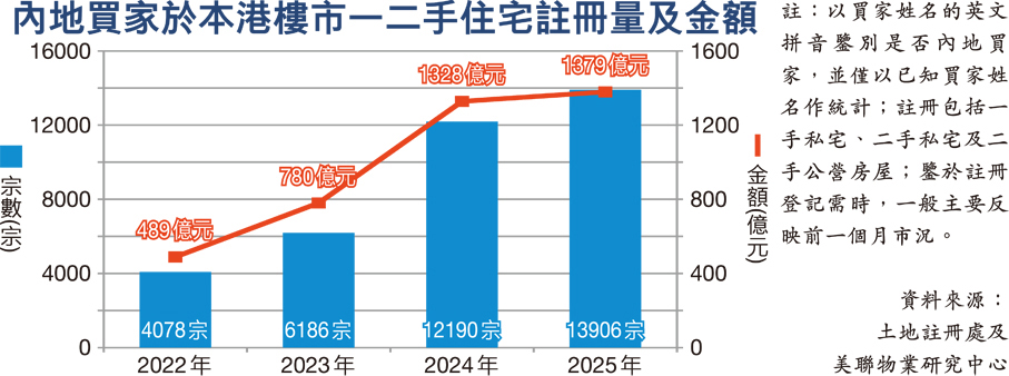 美聯物業分析師岑頌謙指出,按已知買家姓名分析,去年內地買家於本港一、二手住宅市場的註冊量共錄13,906宗,比起2024年12,190宗增加約14.1%;涉及金額高達約1,379億元,亦較2024年的1,328億元上升約3.8%,宗數與金額同創有紀錄以來新高。展望今年,隨多項利好因素持續發揮效應,加上內地專才及高淨值人士視香港為資產配置、自住與子女留學的重要據點,預期內地買家註冊宗數及金額有望再創新高。