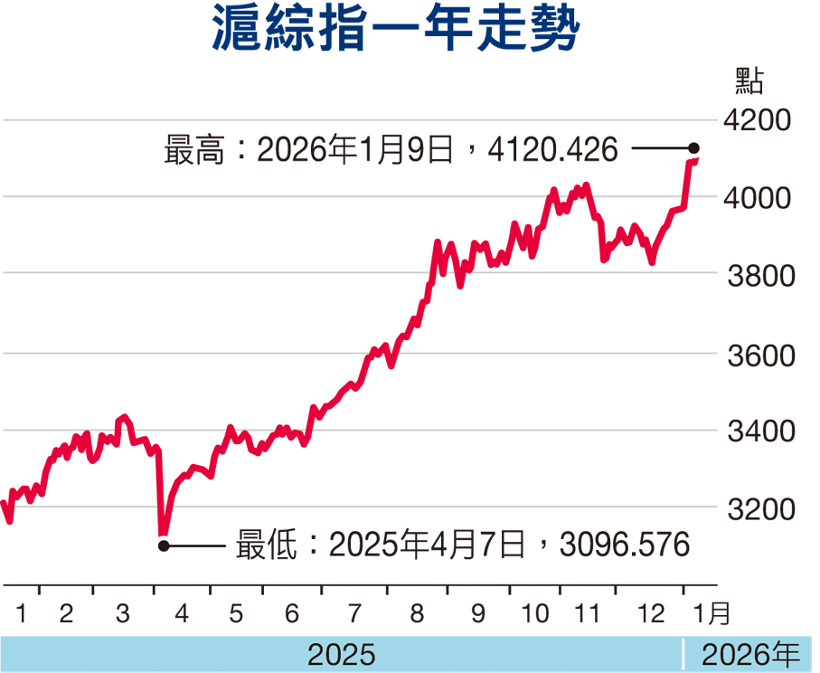 周五A股大盤放量拉升,滬綜指16連陽收漲0.92%,時隔十年再次站上4,100點關口;深成指、創業板指分別上揚1.15%、0.77%;市場成交突破3萬億元(人民幣,下同),逾3,900隻個股上漲。今年首個交易周收穫「開門紅」,滬綜指累計上漲3.82%,深成指周漲4.4%,創業板指周漲3.89%。受MiniMax大漲帶動,A股AI板塊再度開啟狂飆模式。分析認為,在財政金融「雙寬鬆」政策推動下,市場流動性將持續充裕,投資者中高端資產配置需求料繼續增強,「存款搬家」入市潛力有望為後續行情提供支撐。