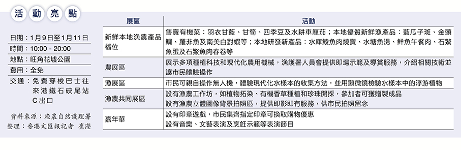 漁農共同展區介紹休閒漁農業發展,包括「農+樂」農場計劃和「漁+樂」魚場計劃、相關的旅遊路線資訊,以及今年將會推出本地漁農產品新統一品牌,提供安全、低碳、優質的本地漁農產品,並介紹其認證和追溯系統。