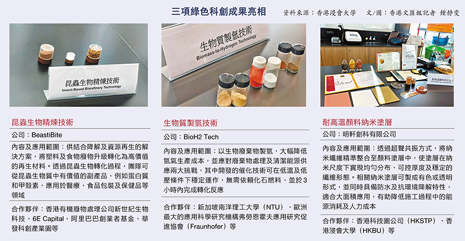 香港浸會大學近年積極投入綠色科技與可持續發展,並配合特區行政長官施政報告及國家「碳中和」目標,力求將科研成果轉化為實際解決方案。浸大昨日介紹其中三項綠色科創成果:革命性的生物質製氫技術,以生物廢棄物製氫,大幅降低氫氣生產成本;昆蟲生物精煉技術,以生物技術將塑膠及廚餘再生為高價值材料;及耐高溫顏料納米塗層,有助減少材料更換和消耗。