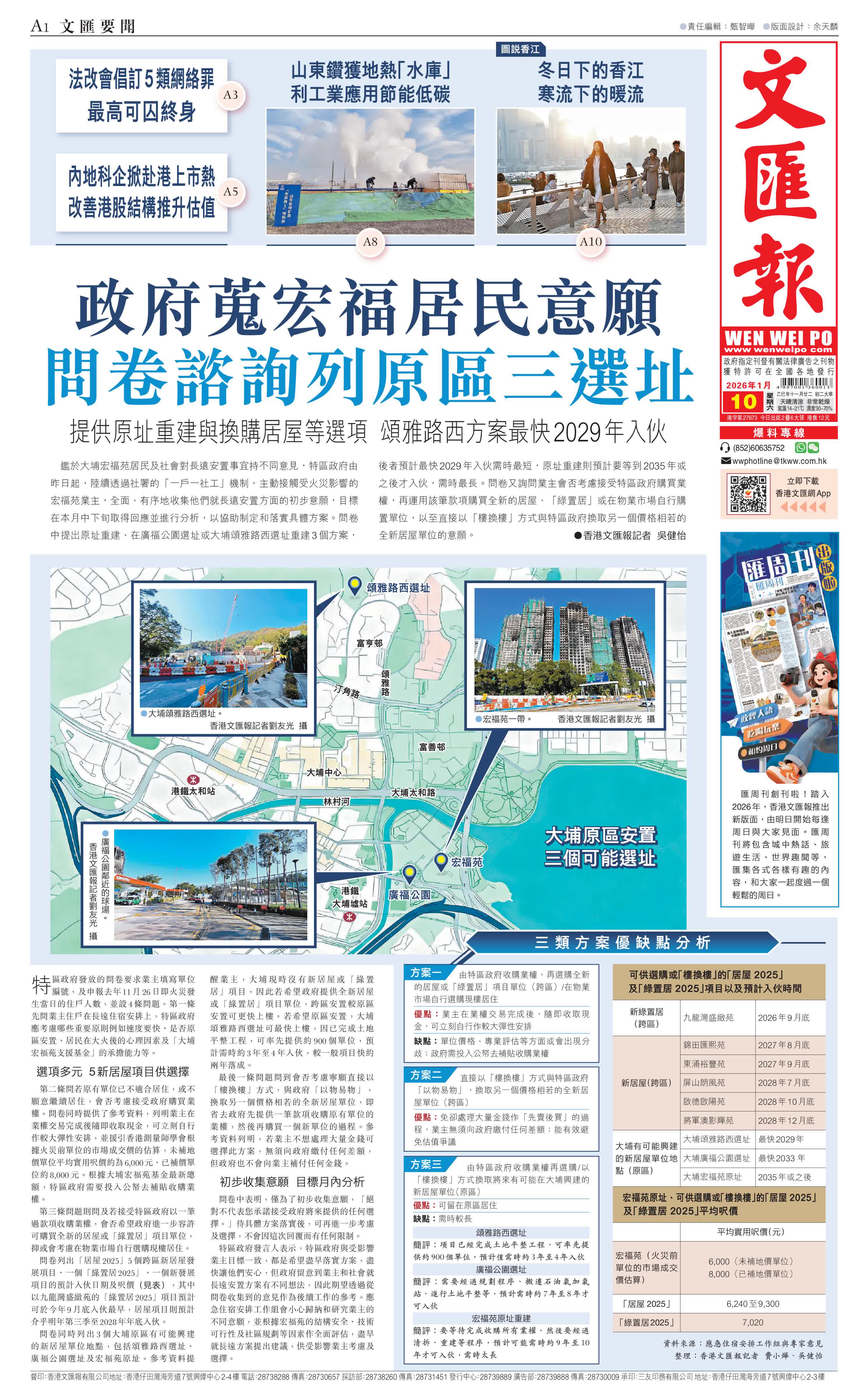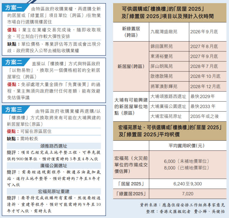 (香港文匯報記者 吳健怡)鑑於大埔宏福苑居民及社會對長遠安置事宜持不同意見,特區政府由昨日起,陸續透過社署的「一戶一社工」機制,主動接觸受火災影響的宏福苑業主,全面、有序地收集他們就長遠安置方面的初步意願,目標在本月中下旬取得回應並進行分析,以協助制定和落實具體方案。問卷中提出原址重建、在廣福公園選址或大埔頌雅路西選址重建3個方案,後者預計最快2029年入伙需時最短,原址重建則預計要等到2035年或之後才入伙,需時最長。問卷又詢問業主會否考慮接受特區政府購買業權,再運用該筆款項購買全新的居屋、「綠置居」或在物業市場自行購置單位,以至直接以「樓換樓」方式與特區政府換取另一個價格相若的全新居屋單位的意願。