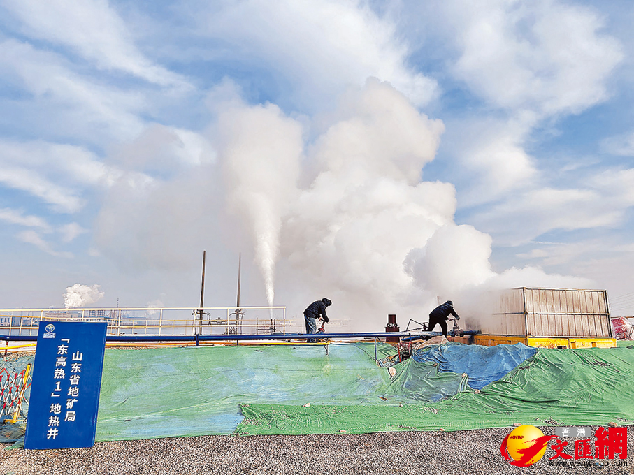 在「東高熱1」井施工現場,抽取上來的熱水瞬間化為水汽直衝天際,釋放着來自地下4,000米的熱能。