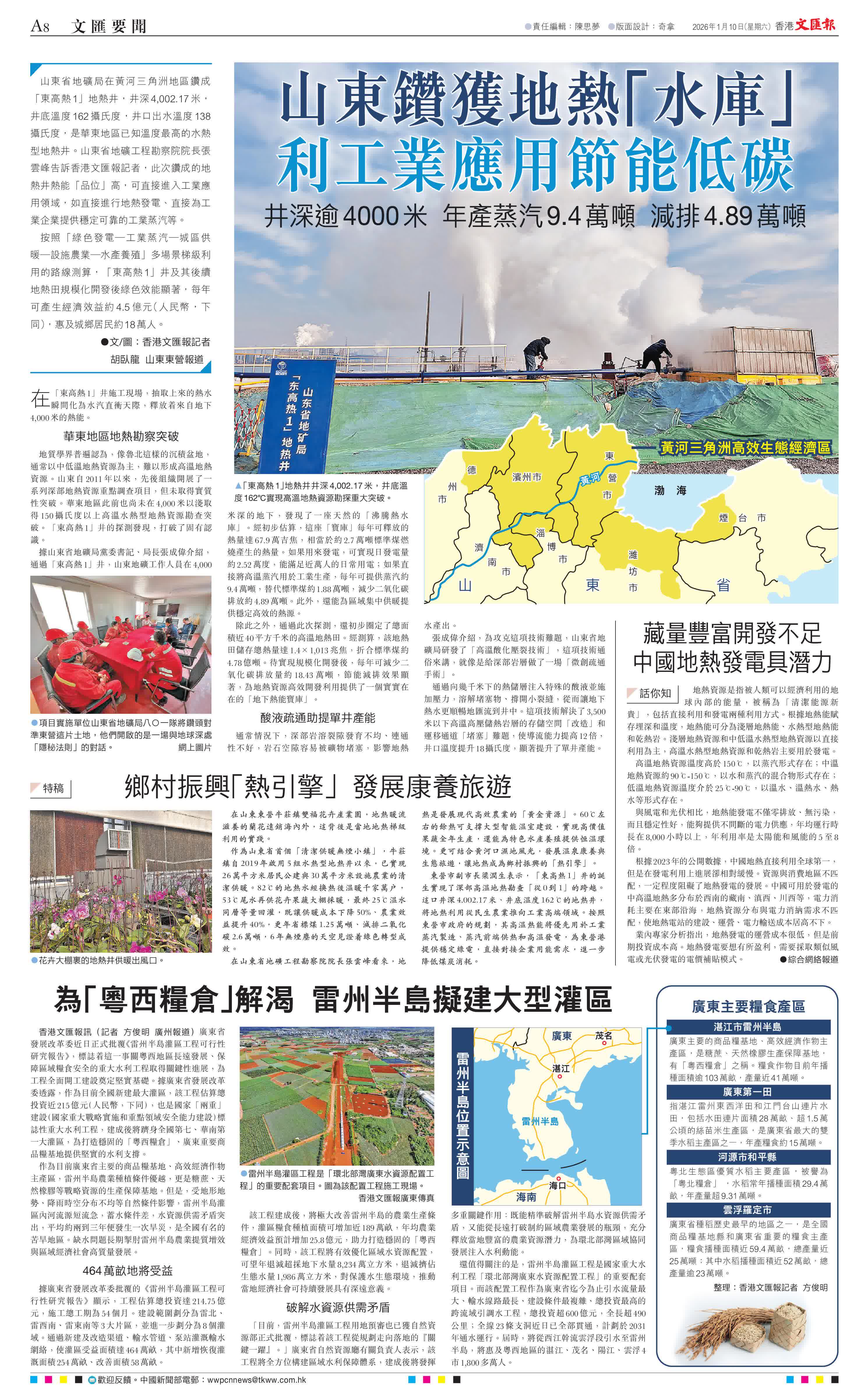 (香港文匯報記者 胡臥龍 山東東營報道)山東省地礦局在黃河三角洲地區鑽成「東高熱1」地熱井,井深4,002.17米,井底溫度162攝氏度,井口出水溫度138攝氏度,是華東地區已知溫度最高的水熱型地熱井。山東省地礦工程勘察院院長張雲峰告訴香港文匯報記者,此次鑽成的地熱井熱能「品位」高,可直接進入工業應用領域,如直接進行地熱發電、直接為工業企業提供穩定可靠的工業蒸汽等。
