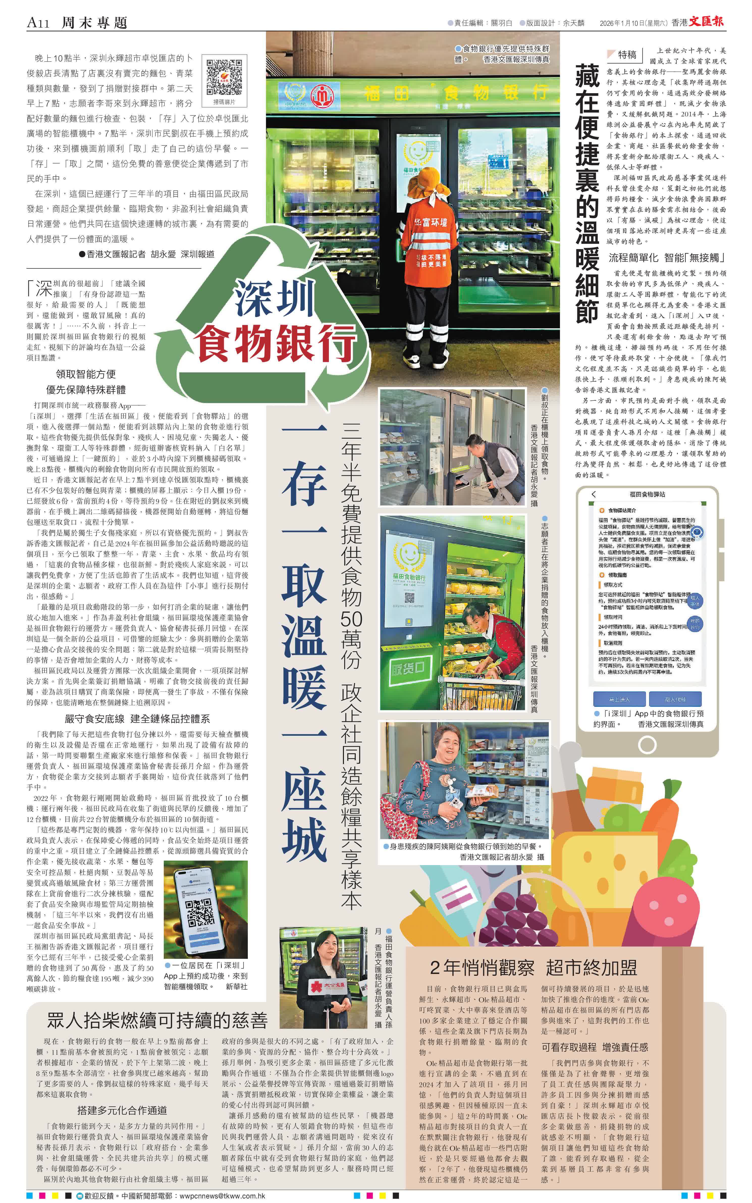 (香港文匯報記者 胡永愛 深圳報道)晚上10點半,深圳永輝超市卓悅匯店的卜俊毅店長清點了店裏沒有賣完的麵包、青菜種類與數量,發到了捐贈對接群中。第二天早上7點,志願者李哥來到永輝超市,將分配好數量的麵包進行檢查、包裝,「存」入了位於卓悅匯北廣場的智能櫃機中。7點半,深圳市民劉叔在手機上預約成功後,來到櫃機面前順利「取」走了自己的這份早餐。一「存」一「取」之間,這份免費的善意便從企業傳遞到了市民的手中。