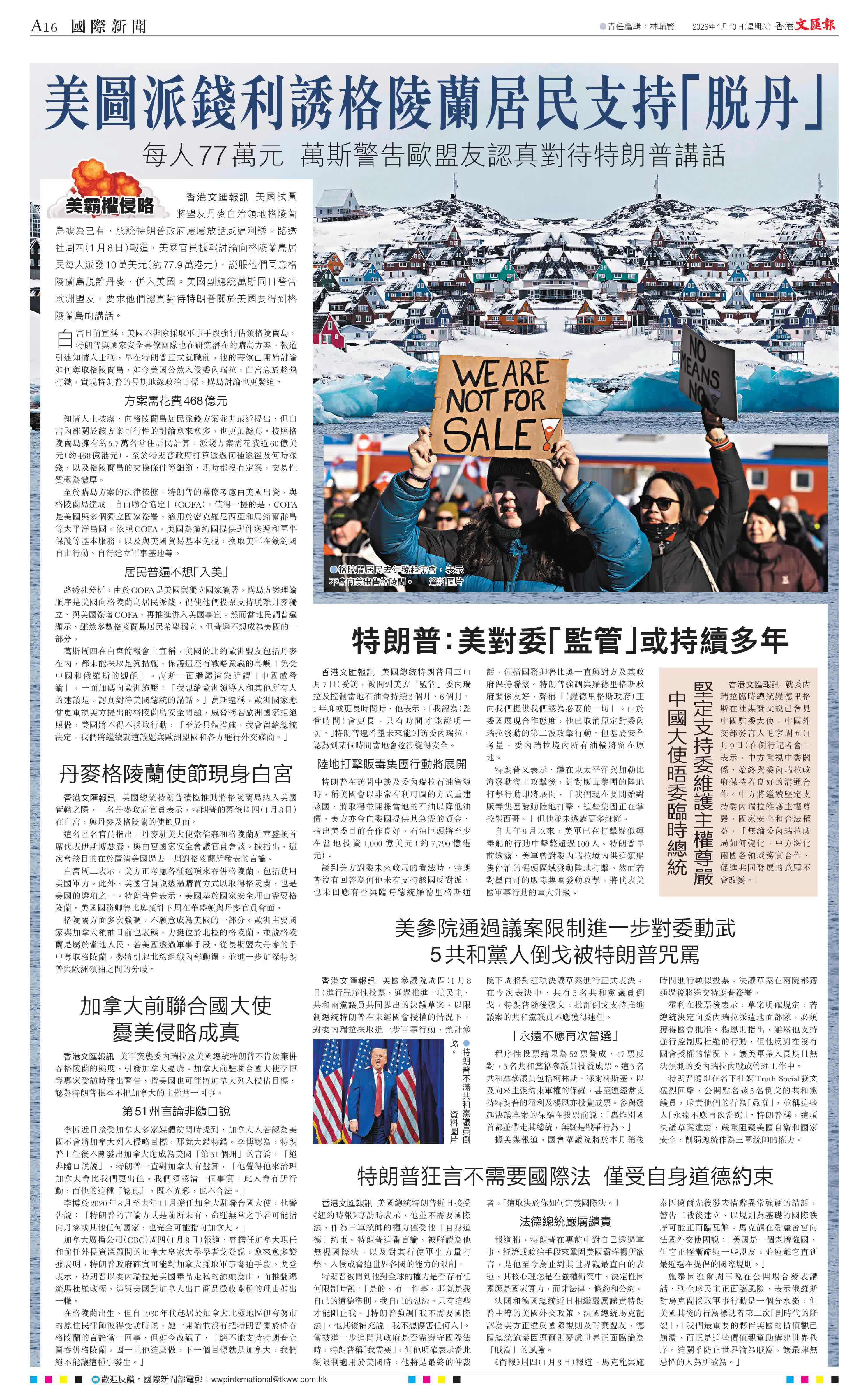 香港文匯報訊 美國試圖將盟友丹麥自治領地格陵蘭島據為己有,總統特朗普政府屢屢放話威逼利誘。路透社周四(1月8日)報道,美國官員據報討論向格陵蘭島居民每人派發10萬美元(約77.9萬港元),說服他們同意格陵蘭島脫離丹麥、併入美國。美國副總統萬斯同日警告歐洲盟友,要求他們認真對待特朗普關於美國要得到格陵蘭島的講話。