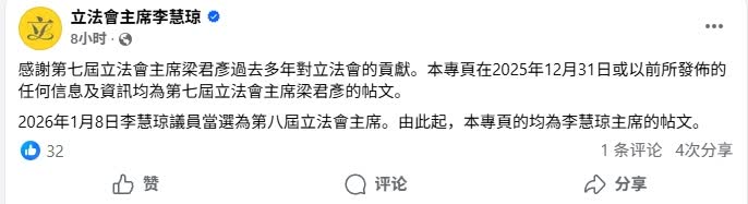 立法會主席Facebook主頁名字更新,由梁君彥改為李慧琼。帖文表示,2026年1月8日李慧琼議員當選為第八屆立法會主席。由此起,該專頁的均為李慧琼主席的帖文。