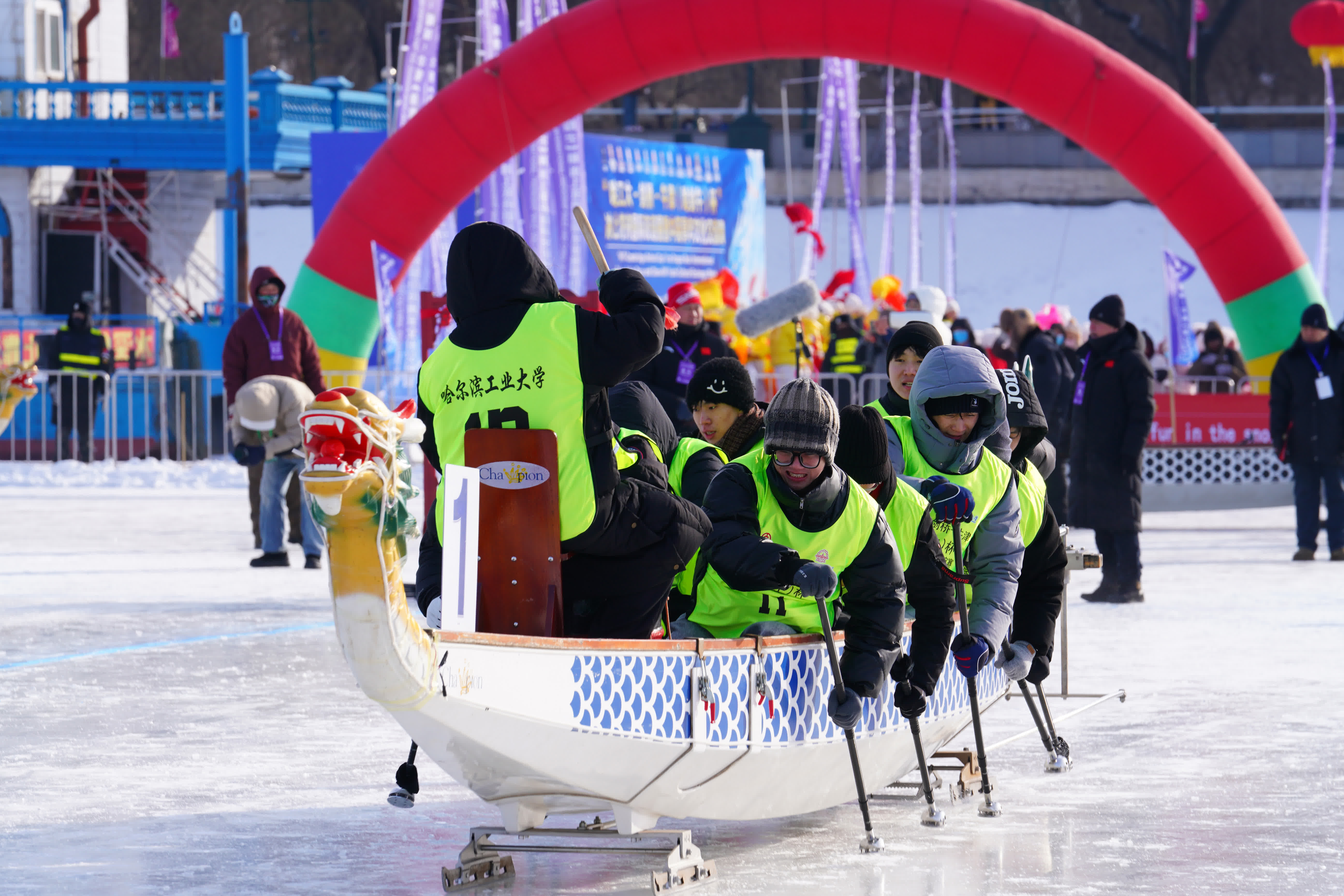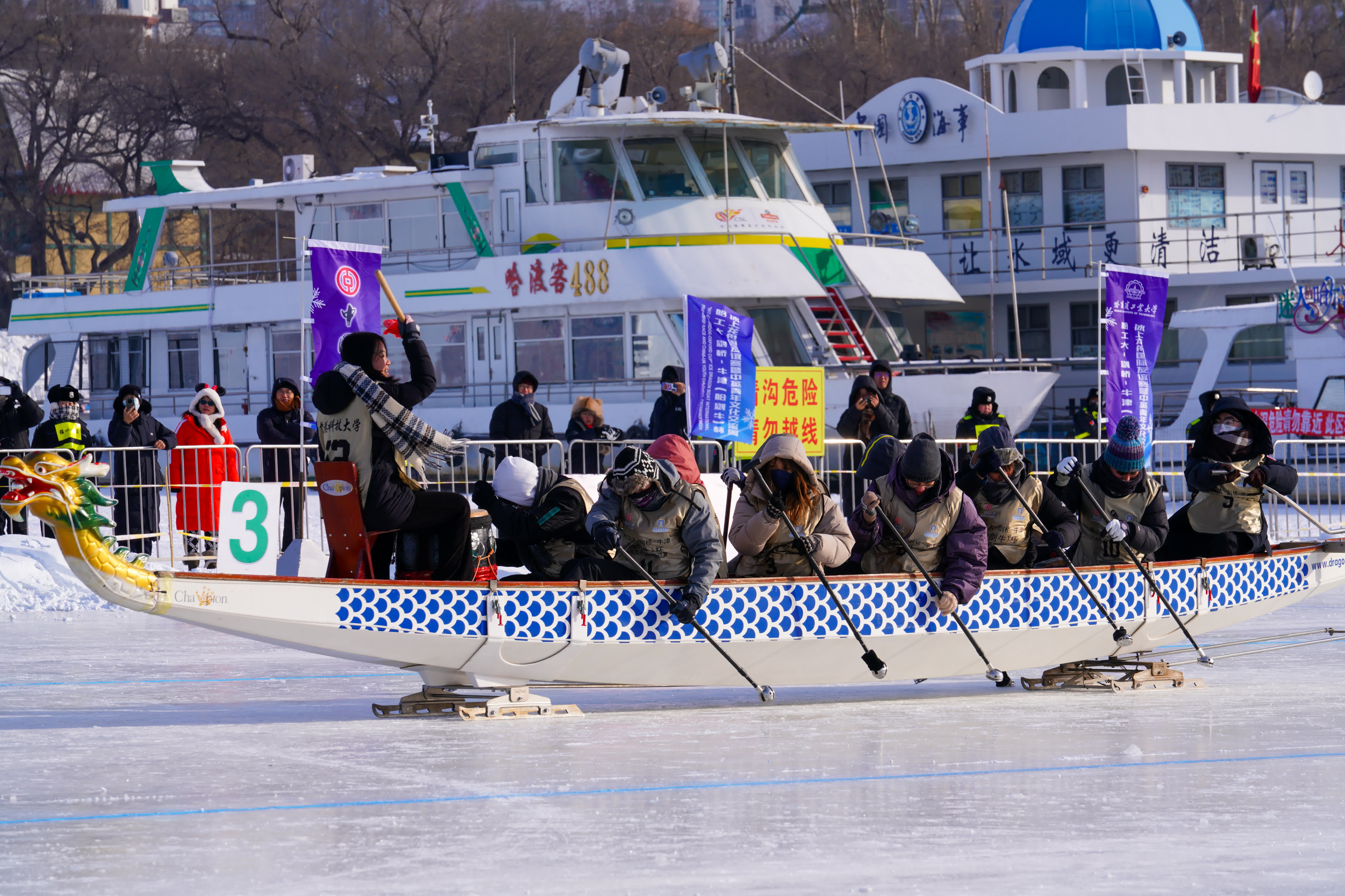 (記者王欣欣 哈爾濱報道)百年賽艇遇上冰上龍舟,不同文明的碰撞交融出青年友誼的詩篇。1月10日,由哈爾濱工業大學主辦的「哈工大-劍橋-牛津(哈劍牛)杯」冰上龍舟國際友誼賽開幕。來自牛津大學、劍橋大學,北京大學、清華大學、哈爾濱工業大學、復旦大學、上海交通大學、南京大學、浙江大學、中國科學技術大學、西安交通大學C9聯盟高校,以及香港中文大學、香港科技大學、澳門大學的14支隊伍參賽,中外青年學子在松花江畔同舟共濟、奮勇爭先。