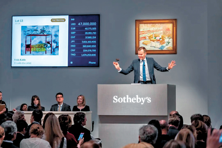 繼克林姆(Klimt)畫作《伊麗莎白·萊德勒肖像》以2.36億美元售出,成為拍賣史上第二貴畫作之後,蘇富比紐約新總部此前又見世界紀錄誕生。墨西哥國寶畫家Frida Kahlo自畫像《El sueno (La cama)》(《睡夢與睡床》),以5,466萬美元成交,打破全球女性藝術家拍賣紀錄。這件穿越睡夢與現實的自畫像,共打破三項紀錄:Frida Kahlo個人拍賣紀錄、拉丁美洲藝術拍賣紀錄,以及女性藝術家拍賣紀錄。
