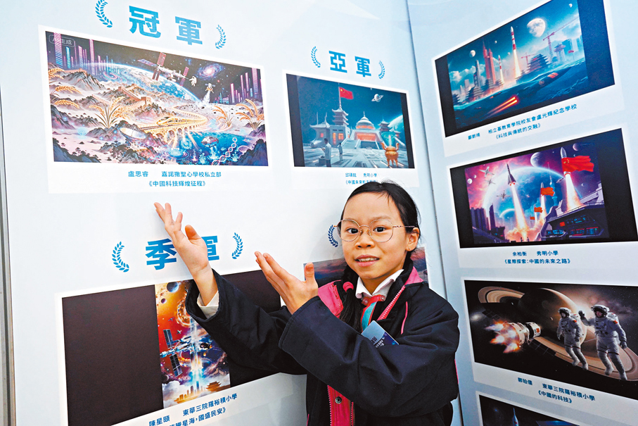 嘉諾撒聖心學校私立部4年級生盧思睿憑着作品《中國科技輝煌征程》奪得今次挑戰賽Ⅱ小學組冠軍。身形小巧的她,身高甚至不及自己的作品張貼的高度。她分享創作過程時說:「我把要求告訴AI軟件『豆包』,例如中國科技發展、藍色科技元素、金色線條、量子技術等,讓它替我作畫。」她會不斷調整提示詞與構圖細節,從顏色、材質到光影層次逐步完善,最終完成了兼具科技感與美學的作品。
