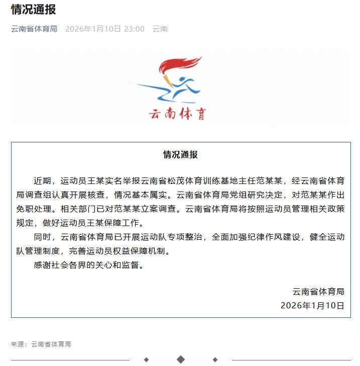 雲南省體育局1月10日晚間發布情況通報。通報稱,近期,運動員王某實名舉報雲南省松茂體育訓練基地主任范某某,經雲南省體育局調查組認真開展核查,情況基本屬實。雲南省體育局黨組研究決定,對范某某作出免職處理。相關部門已對范某某立案調查。雲南省體育局將按照運動員管理相關政策規定,做好運動員王某保障工作。