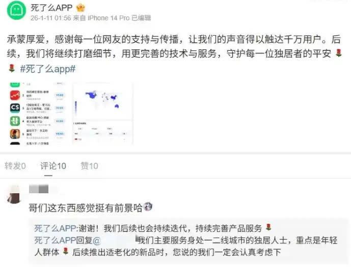 「死了麼」開發者今日(11日)在微博發文回應爆火:「承蒙厚愛,感謝每一位網友的支持與傳播,讓我們的聲音得以觸達千萬用戶。後續,我們將繼續打磨細節,用更完善的技術與服務,守護每一位獨居者的平安。