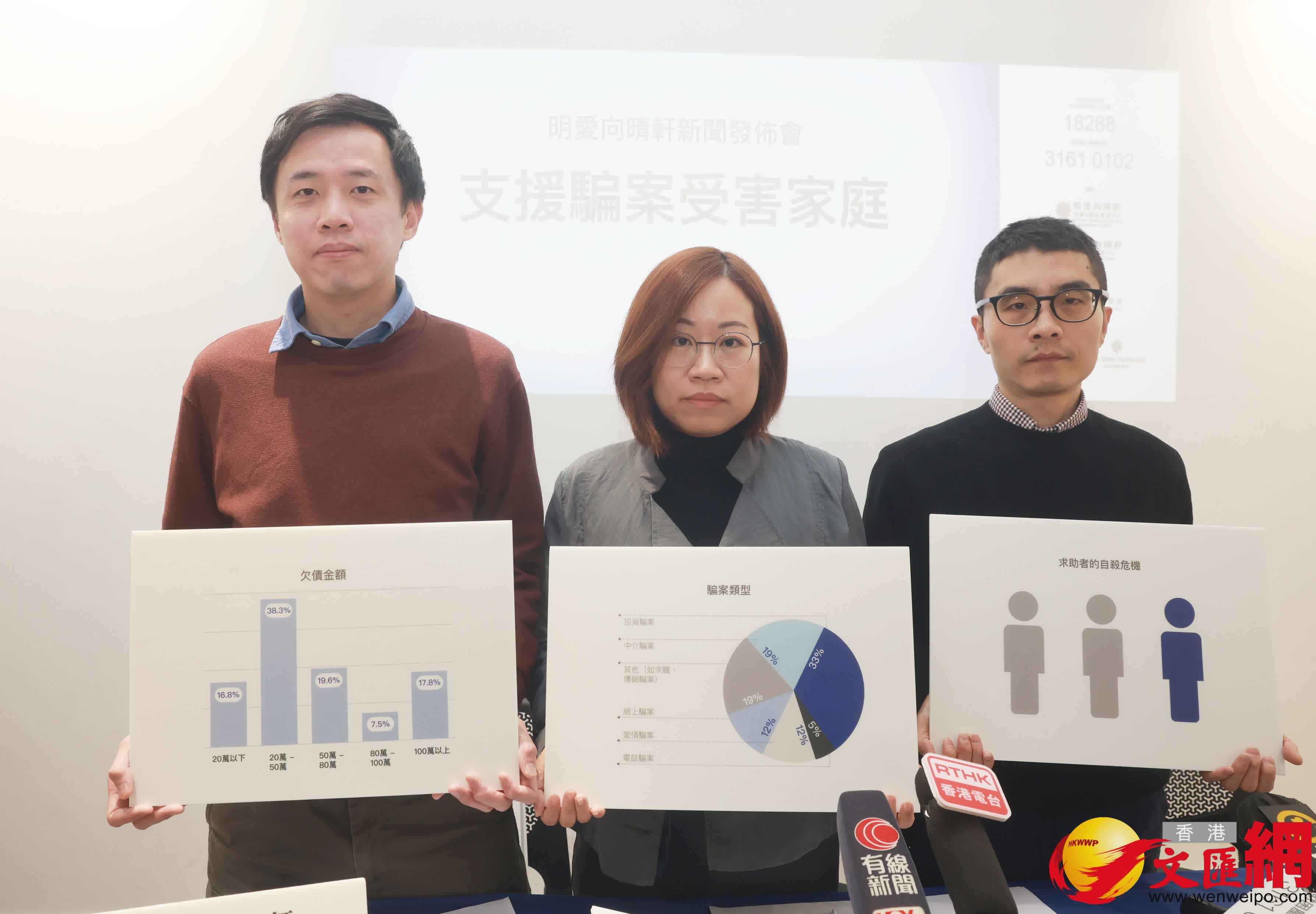 香港文匯報訊(記者 李芷珊)鑑於香港騙案問題持續嚴重,支援騙案受害家庭刻不容緩,明愛向晴軒今日(11日)舉行「支援騙案受害家庭」新聞發布會,分析過去一年的求助數據,以及分享騙案受害人的特徵及心路歷程,並提出具體建議,鼓勵受害者及家人及早求助,防止危機惡化。