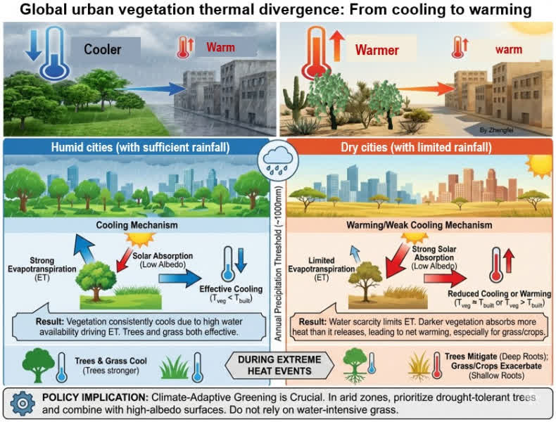 團隊解釋,這種「升溫悖論」的根源在於水分是植被發揮降溫效能的「燃料」。在缺水的城市環境中,植物難以通過蒸散作用有效釋放熱量,其降溫能力顯著減弱。與此同時,深色的植物葉面會吸收更多太陽輻射(低反照率),其所吸收的熱量甚至可能超過其通過蒸發所能釋放的熱量,從而導致淨升溫效應。