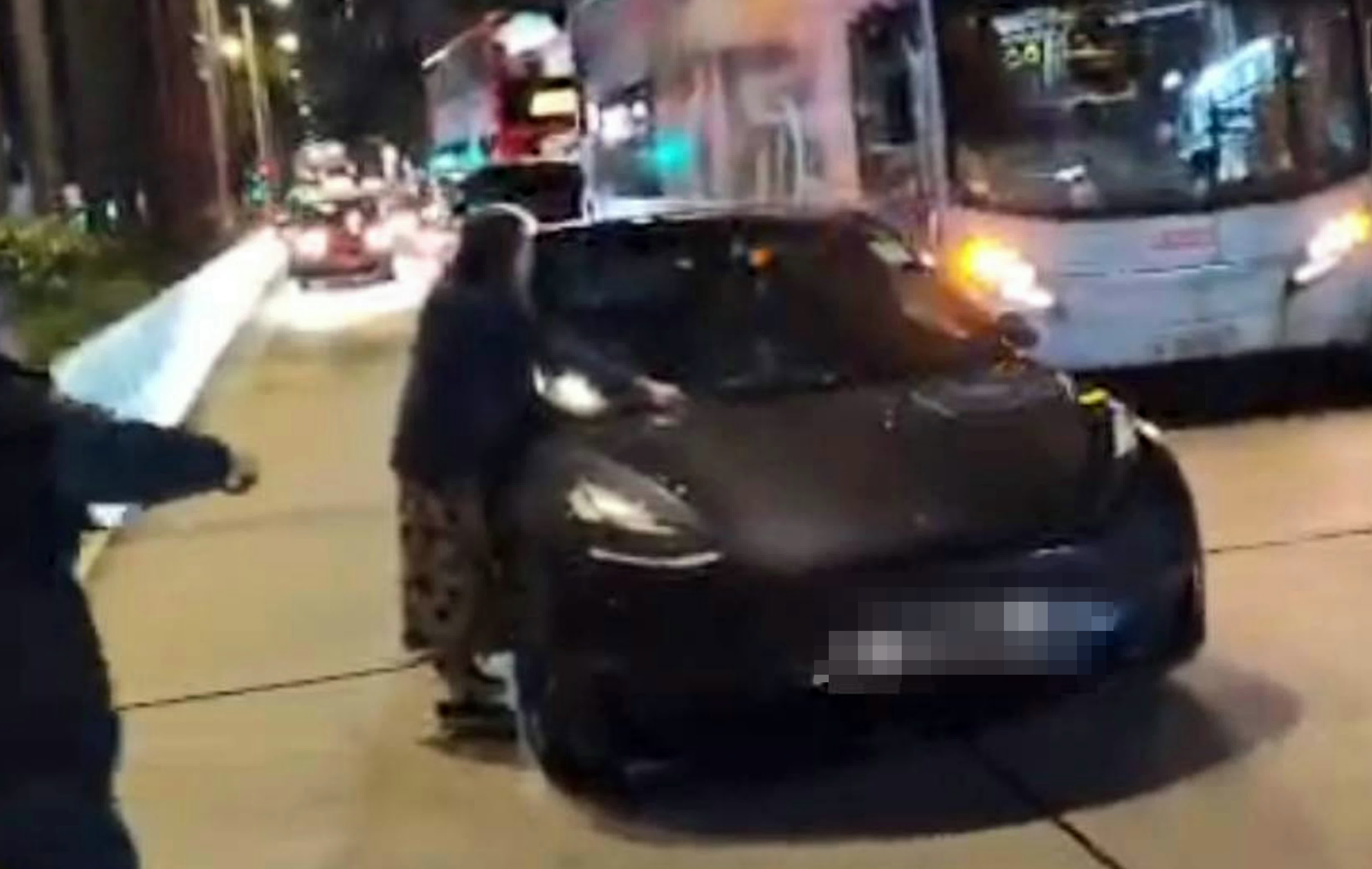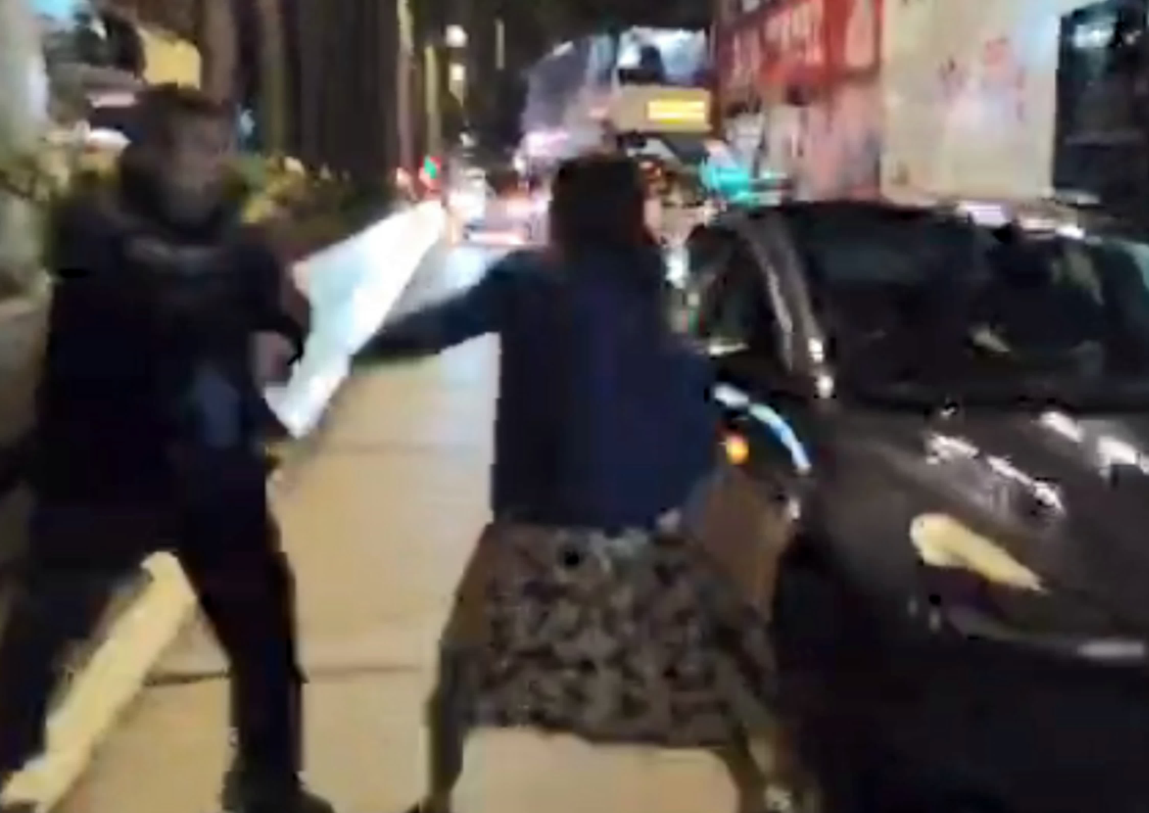 兩車司機見狀即大聲喝止,該女子隨後走向Tesla私家車的右邊車門處,破壞倒後鏡並嘗試進入車廂。Tesla司機立即上前阻止,惟女子竟揮拳企圖施襲,嚇得Tesla司機急忙閃避,直呼:「佢癡線㗎!」發帖者續指,其後見該名外籍女子手持利刀揮舞:「我即刻上返車保障自己。安全情況下幫車主報警。警察嚟到拎晒盾牌。警棍,制服女事主!」