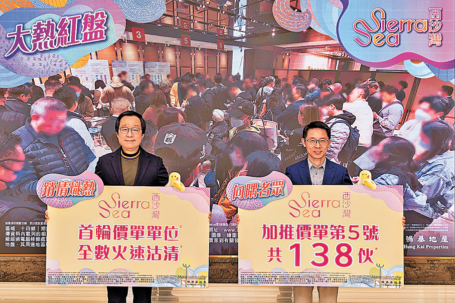 香港文匯報訊(記者 周曉菁)2026年新盤頭炮打響,新地旗下西沙SIERRA SEA第2A期周六開售213伙價單單位全數沽清,周日接連加推4號及5號價單,共涉211伙,折實價由350.1萬元起。新地副董事總經理雷霆昨表示,兩張價單價格略有不同,僅是樓層與景觀的分別,強調所有單位均屬原價加推。
