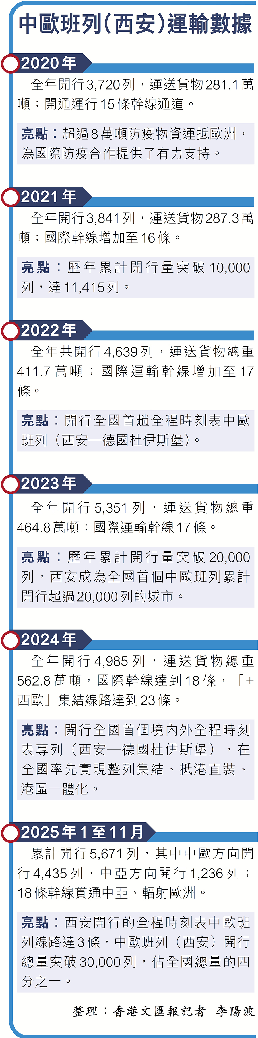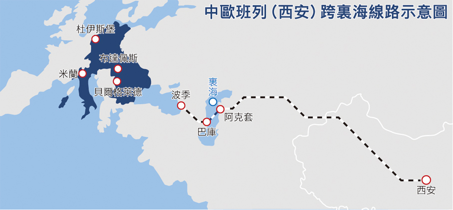 作為連接中國與裏海地區的戰略新通道,2019年10月首發的中歐班列(西安)跨裏海線路,和以往中歐班列大多採用陸地運輸的方式不同,其採用「鐵—海—鐵」海鐵聯運方式。班列從西安發車後於新疆霍爾果斯口岸出境,途經中亞多個國家並在裏海轉成海運,然後再將貨物運往歐洲多個目的地。隨着跨裏海國際運輸走廊班列越開越密,當前中歐班列(西安)跨裏海線路時效由15天至23天縮短至11天左右,基本實現「天天班」。截至2025年11月底,跨裏海班列累計開行466列,運量佔全國總量的50%。