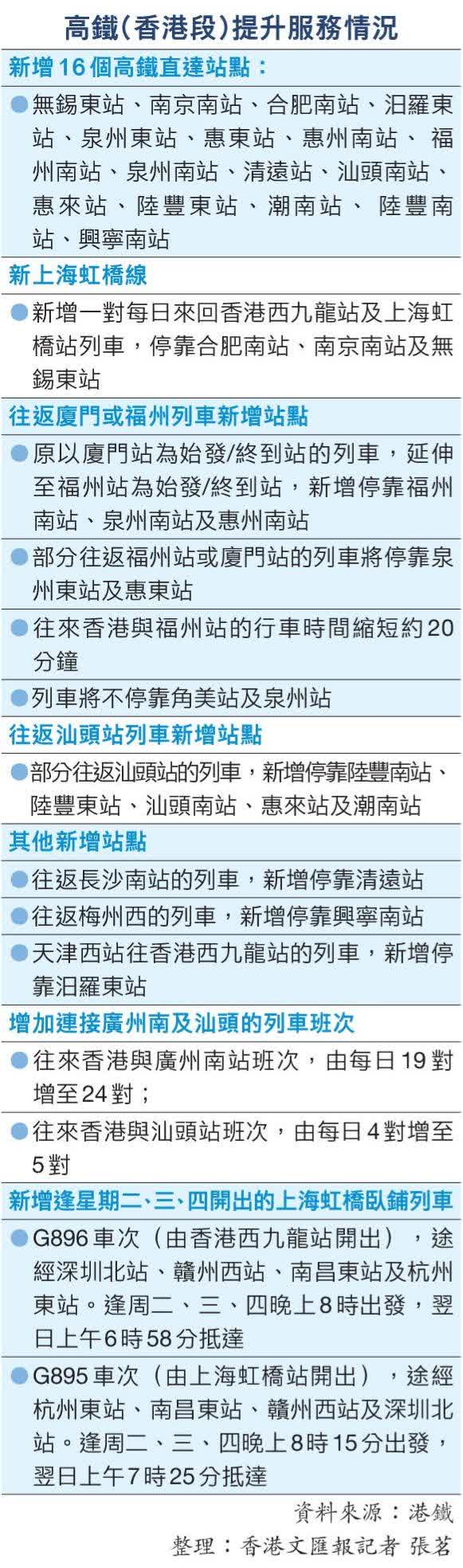 港鐵指,是次高鐵香港段服務升級亦着力提升頻率與效率,在短途服務方面,往來香港西九龍站與廣州南站的列車班次,將由每日19對大幅增加至24對,進一步便利大灣區交流。而往來香港與潮汕、廈門、福州地區的列車將途經更多站點,為旅客提供更多選擇。其中,往來西九龍站與福州站的行車時間將縮短約20分鐘。此外,每日往返西九龍與汕頭站的列車也將由4對增至5對。