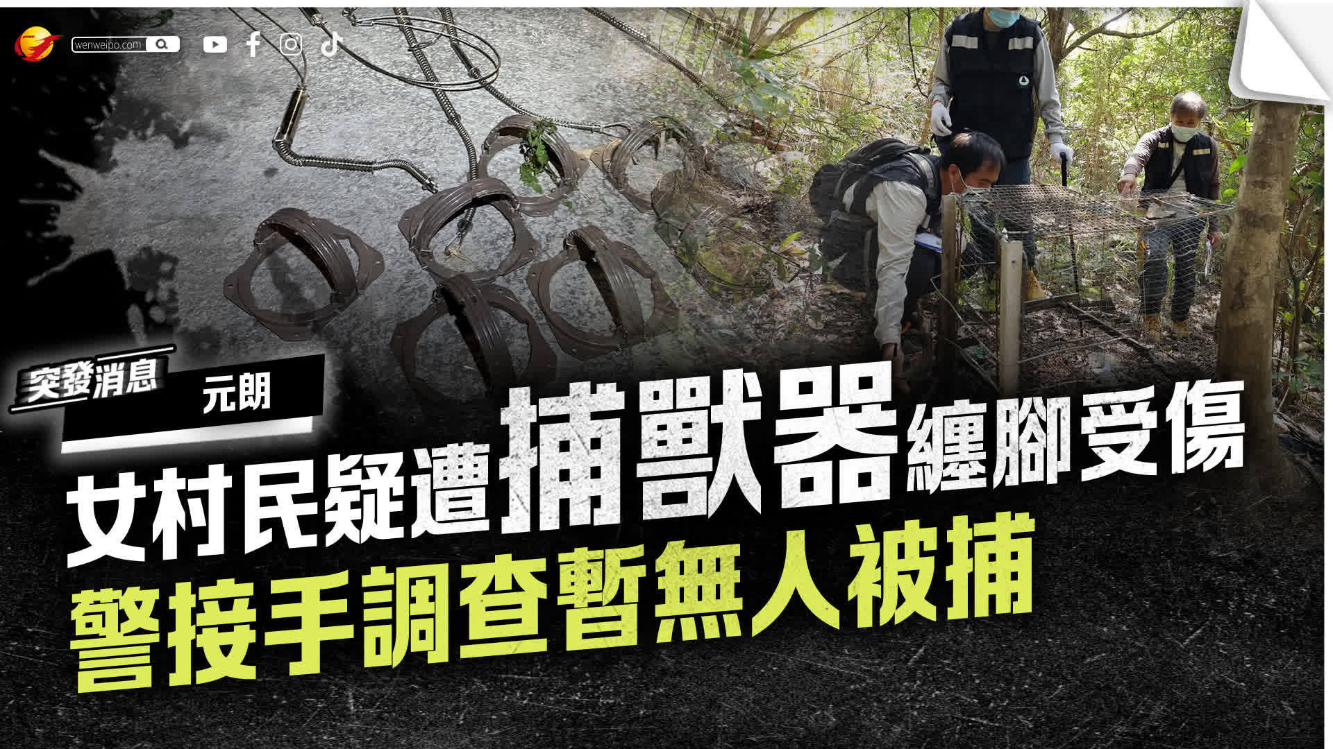 香港文匯報訊(記者 蕭景源)今日(12日)上午約11時14分,警方接報指一名女子在元朗南坑排一個山坡上,疑遭捕獸器夾腳受傷,動彈不得。消防及救援人員奉召到場,證實該名女子已在其他村民協助下解困,事主無表面傷痕,經檢查後,她拒絕送院。警方已接手案件列作有人意外受傷跟進,以及檢走一個連接鋼索的懷疑捕獸器調查,暫時無人被捕。