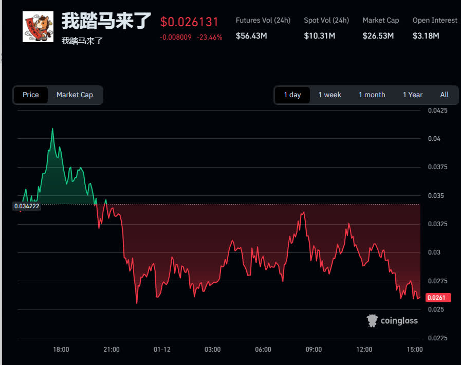 據Coinglass數據,新迷因幣「我踏馬來了」價格由升轉跌,其24小時最高0.040883美元,現報0.026131美元,日內跌幅達23.46%。同時,日內市值最高達4,085萬美元,現市值2,653萬美元。
