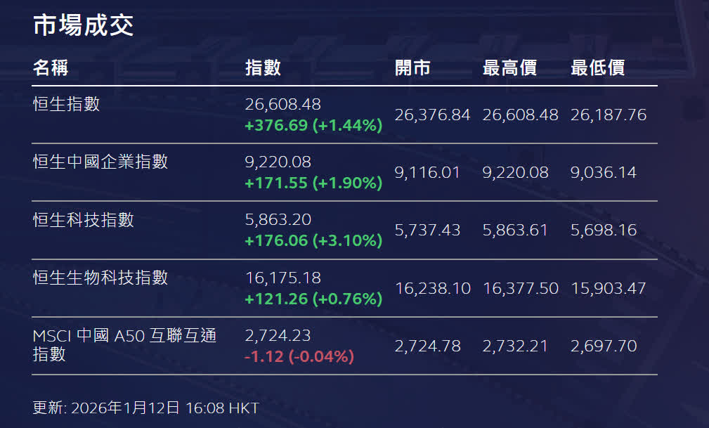 香港文匯報訊 在科技股轉強帶動下,港股今日顯著向上突破。恒生指數收報26,608點,見全日高位,全日累升376點或1.44%。國企指數升1.90%。恒生科技指數升3.10%,表現相對突出。