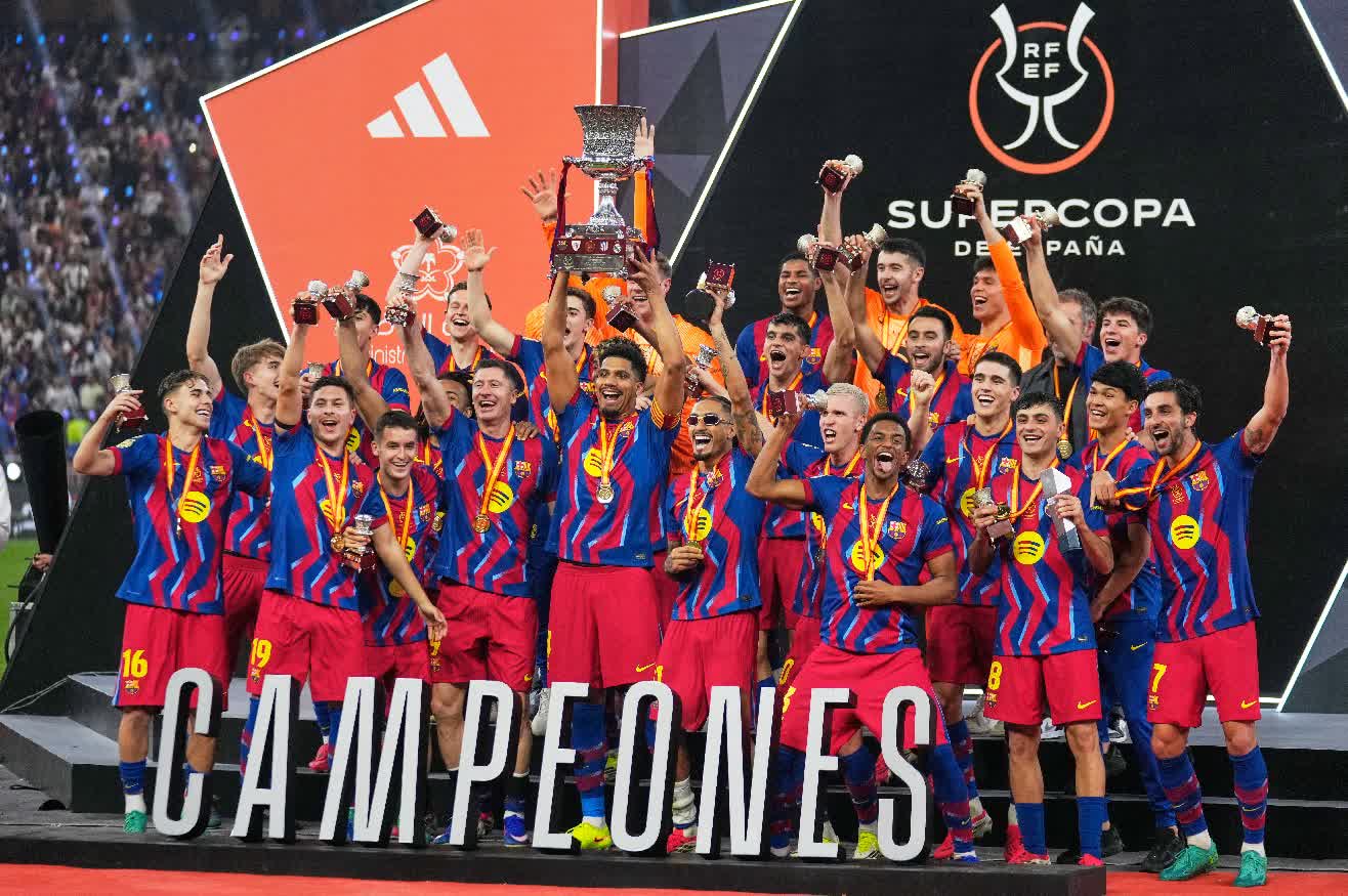 香港文匯報訊(記者 葉詩敏)周一(12日)凌晨西超盃決賽上演「國家打吡」,巴塞隆拿憑藉拉芬夏梅開二度,以3:2險勝皇家馬德里,第十六次奪下西超盃冠軍,達成兩連霸外更是連續兩屆擊敗死敵捧起冠軍獎盃。