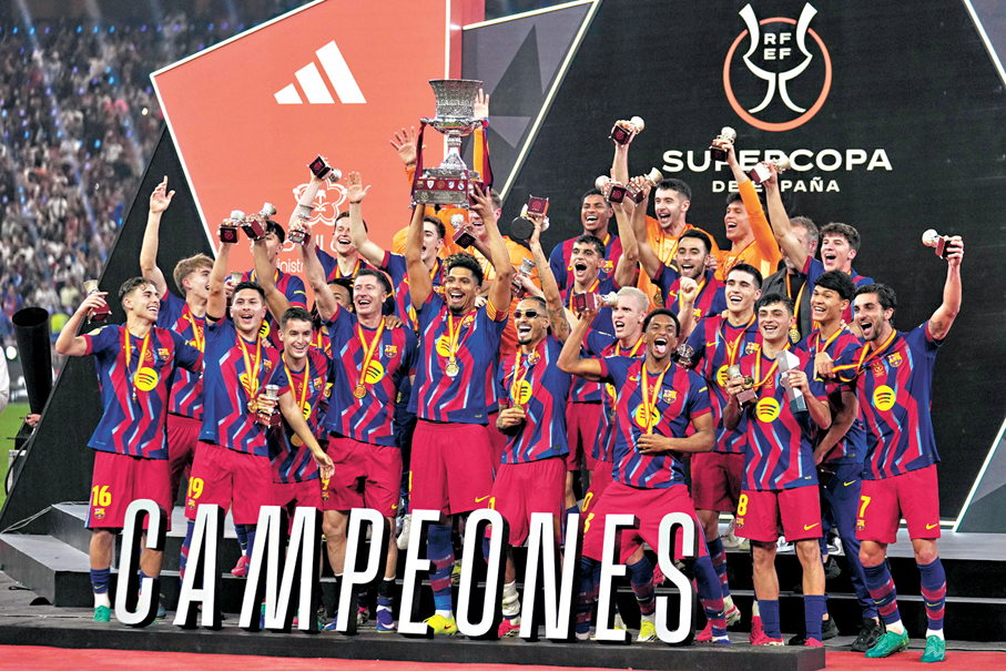香港文匯報訊(記者 葉詩敏)周一(12日)凌晨西超盃決賽上演「國家打吡」,巴塞隆拿憑藉拉芬夏梅開二度,以3:2險勝皇家馬德里,第十六次奪下西超盃冠軍,達成兩連霸外更是連續兩屆擊敗死敵捧起冠軍獎盃。