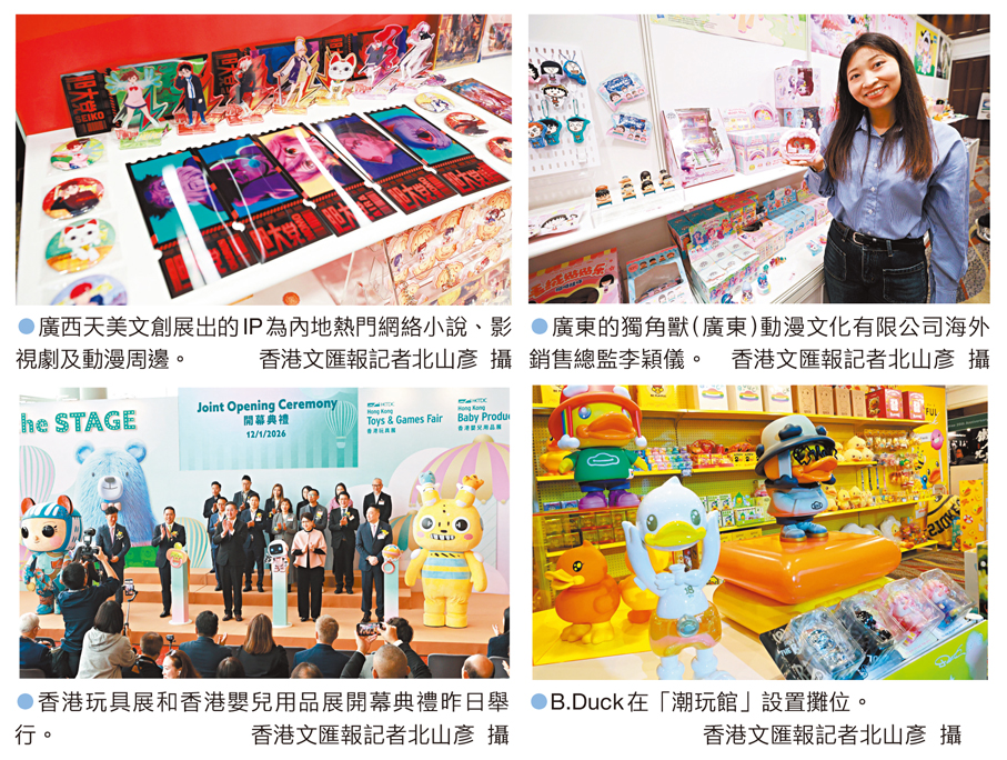 首度登場的「潮玩館」為展覽其中一個亮點,帶來多個人氣IP的潮玩展品。廣西天美文化創意有限公司銷售助理蔣佳接受香港文匯報訪問時表示,公司展出的IP均源自內地熱門網絡小說、影視劇及動漫周邊,產品則以徽章、立牌、冰箱貼、鎖匙扣等為主,目前在內地市場擁有廣泛受眾,但在香港地區的知名度仍有待提升。因此今次首度參展的核心目標,是要為旗下產品爭取更多曝光機會。