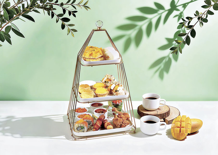一系列芒果入饌的精緻美點,以時尚典雅的三層下午茶架呈獻,先嘗一系列滋味鹹點,芒果蝦蟹籽沙律率先帶來清爽滋味,芝士焗黑松露肉醬配脆多士更是惹味之選。甜點方面,擁有豐富甜品製作經驗的糕餅總廚以芒果打造一系列美點,當中推薦有酒店得獎甜品芒果拿破崙,層層鬆脆的酥皮夾着香甜的新鮮芒果及細膩柔滑的秘製吉士忌廉,口感獨特,驚艷味蕾。另一誠意推介有芒果芝士撻,一口嘗盡芝士的濃郁幼滑,芒果的鮮甜果香及撻殼的香脆酥甜,打造令人回味無窮的滋味;鮮忌廉芒果蛋白卷,外層卷蛋蓬鬆柔軟,內餡配上香甜芒果粒及法國輕盈香滑鮮忌廉,是深受食客喜愛的經典滋味。再配上一杯熱茶或咖啡,點亮你愜意美好的下午時光。
